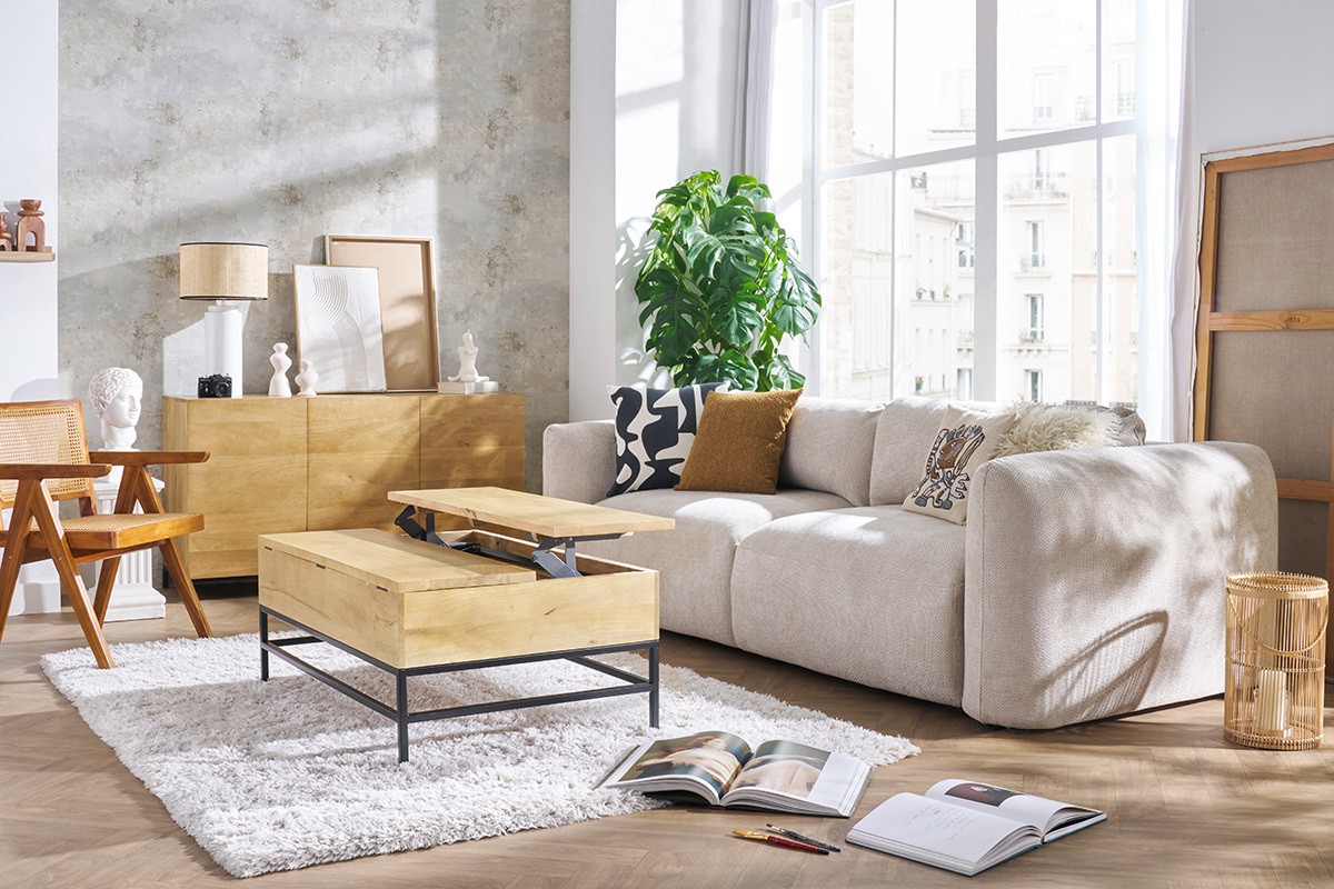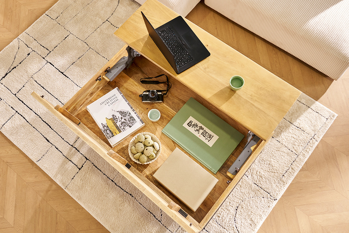 Pratique, cette table basse avec rangement dispose d'un plateau relevable, idéal pour travailler ou bien pour prendre l'apéro ! Grâce à son plateau relevable, cette table basse YPSTER dispose d'un grand espace de rangement. Magazines, télécommandes, vous trouverez enfin un coin pour les ranger.