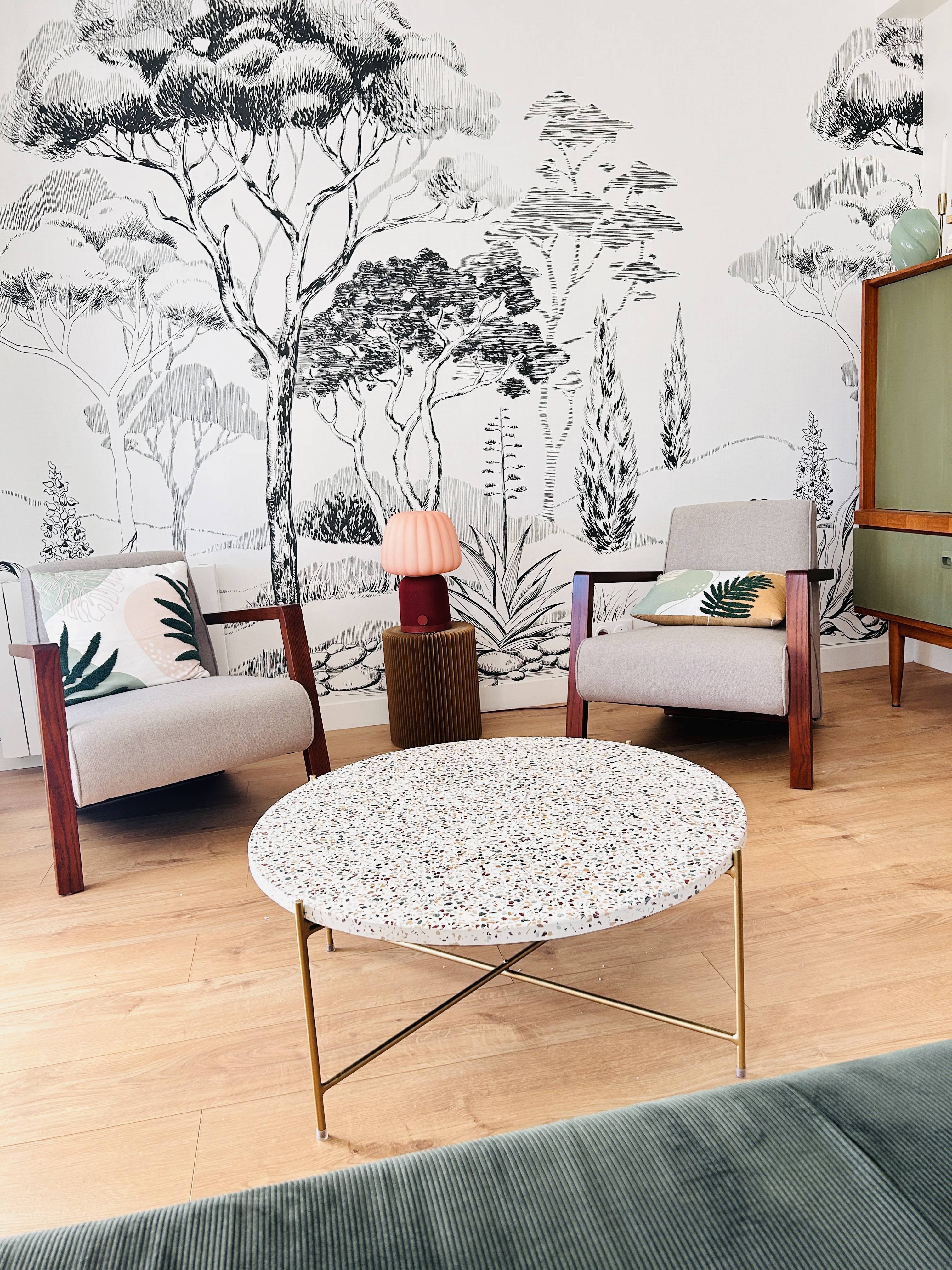 À la fois chic et singulière, cette grande table basse ronde (L81.5 x L81.5 x H35.5 cm) se distingue par les motifs irréguliers de son épais plateau en terrazzo (D80 x E2.3 cm). Entre prestige et simplicité, fantaisie et naturel, il suffit de prononcer le nom de ce matériau moucheté - et reconnaissable entre mille ! - pour en ressentir toute la poésie. Le terrazzo évoque naturellement la douceur de l'Italie, le charme des palazzo, les sols des trattorias... Grande tendance Art Déco, voilà un matériau qui a su renaître de ses cendres pour investir les intérieurs les plus tendances et les lieux les plus branchés !