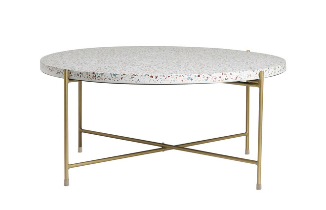 Le plateau à la composition hypnotique - mélange de fragments de pierres naturelles colorées liées par un ciment poli - gagne en superbe grâce au piètement filaire et aérien en métal doré qui le soutient. Cette table basse ronde en terrazzo et métal doré offre un mix and match éloquent de couleurs et matières. Coup de foudre dès le premier regard !