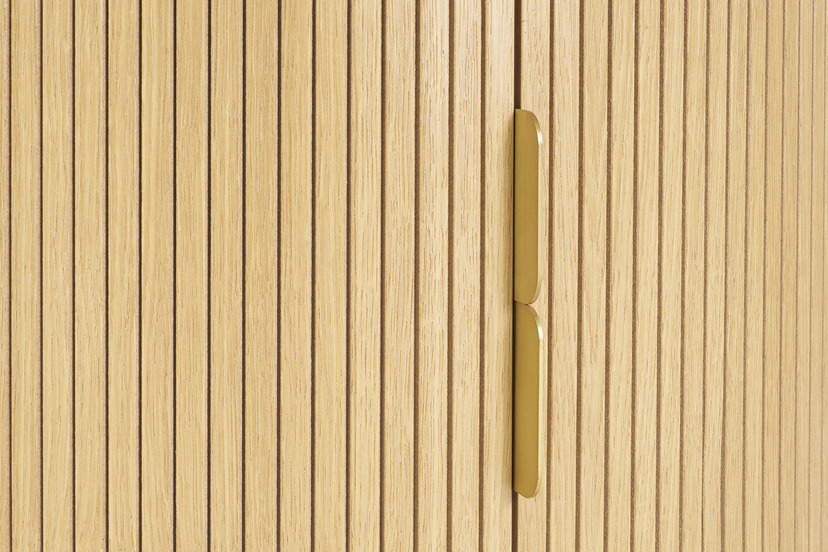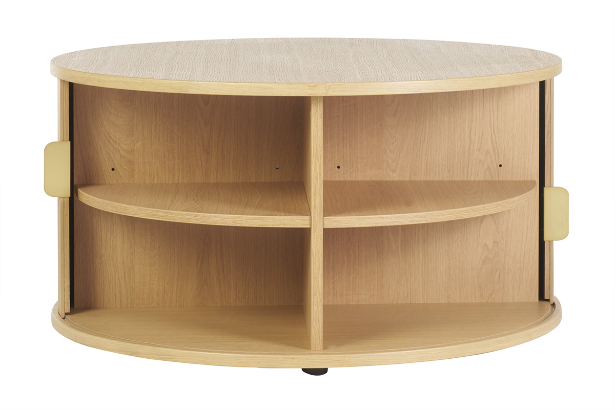 Le point fort de la table basse EPIC réside dans son ingénieux système de rangement. Elle est équipée de deux portes coulissantes qui dissimulent un espace de stockage interne compartimenté. Ce rangement astucieux permet de garder à portée de main vos magazines, télécommandes, jeux de société ou autres objets du quotidien, tout en préservant l’esthétique minimaliste de votre pièce. La structure arrondie, soulignée par des lignes verticales striées, confère un style graphique et dynamique à l’ensemble.