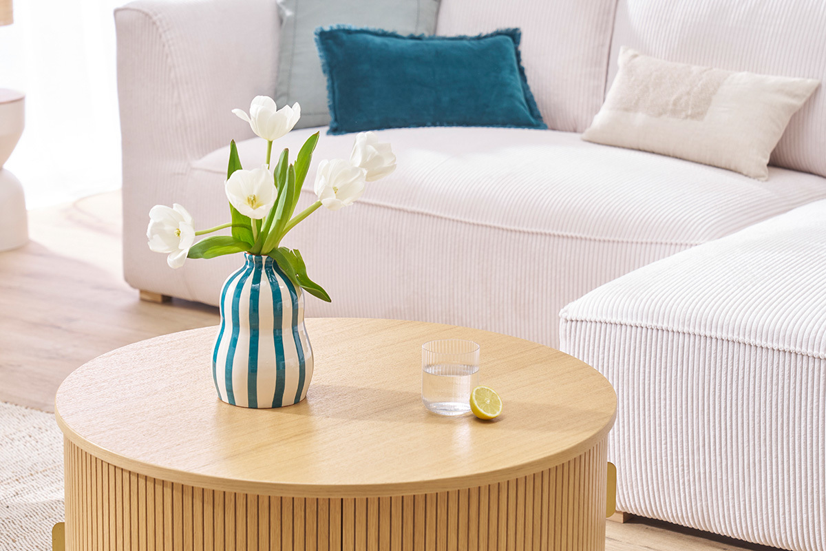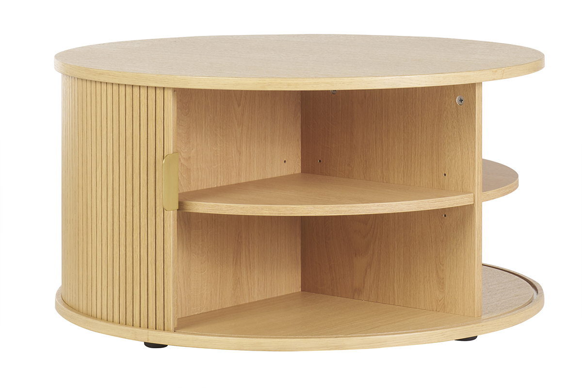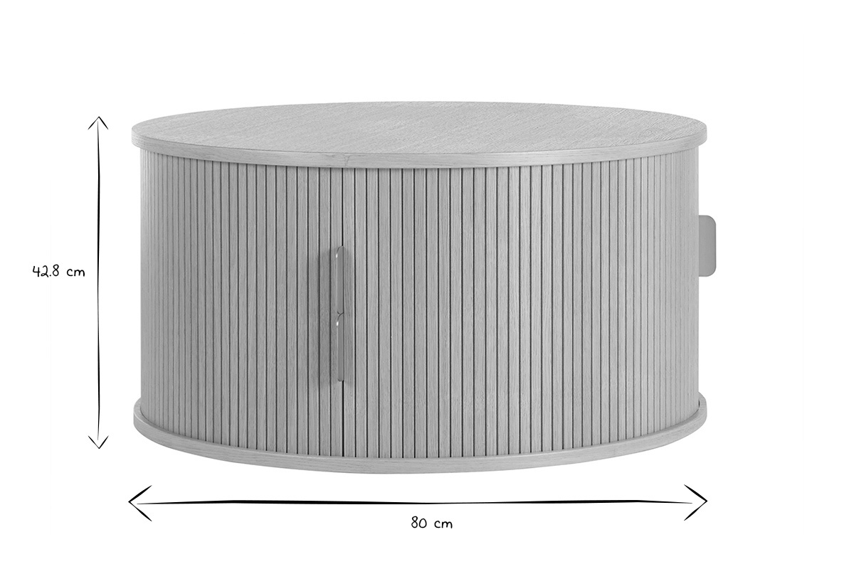 Fabriquée en Europe, cette table basse ronde mise sur la qualité et la durabilité. Les poignées discrètes en métal doré apportent une note subtile de raffinement, tout en facilitant l’ouverture fluide des portes coulissantes. Sa base légèrement surélevée lui donne un aspect léger et facilite également le nettoyage autour du meuble.