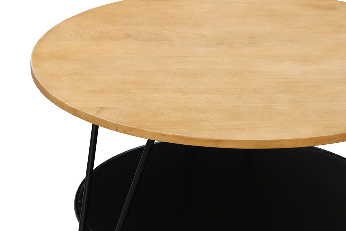 Pièce maîtresse d'un séjour, cette table basse ronde se veut aussi conviviale pour vos moments de partage entre amis que cosy pour une ambiance intimiste en famille. Le large plateau (L80 x L80 cm) en bois massif, robuste et facile d'entretien, est soutenu par un solide piètement en métal. Autre caractéristique appréciable et très pratique : la tablette inférieure qui vous permettra de ranger magazines et petits objets du quotidien.