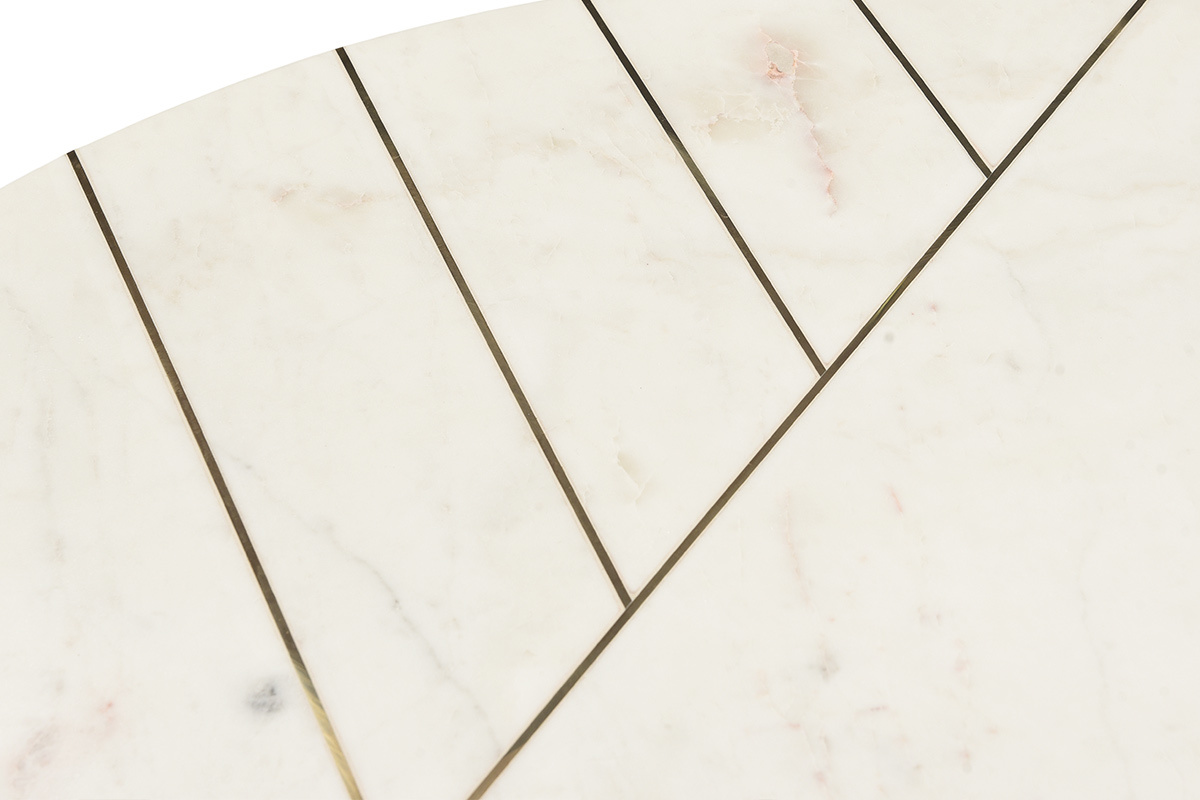 Le marbre est un matériau noble apprécié pour son raffinement et ses nervures uniques. La table basse design SILLON l'associe à un motif graphique et une structure en laiton doré pour un rendu moderne.