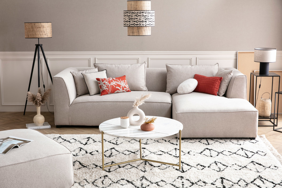 Les dimensions généreuses de cette table basse ronde permettent d'aménager un véritable espace convivial dans le salon tout en donnant un style affirmé à la pièce. On l'accompagne d'un canapé design et d'un fauteuil contemporain pour un séjour chic et tendance.