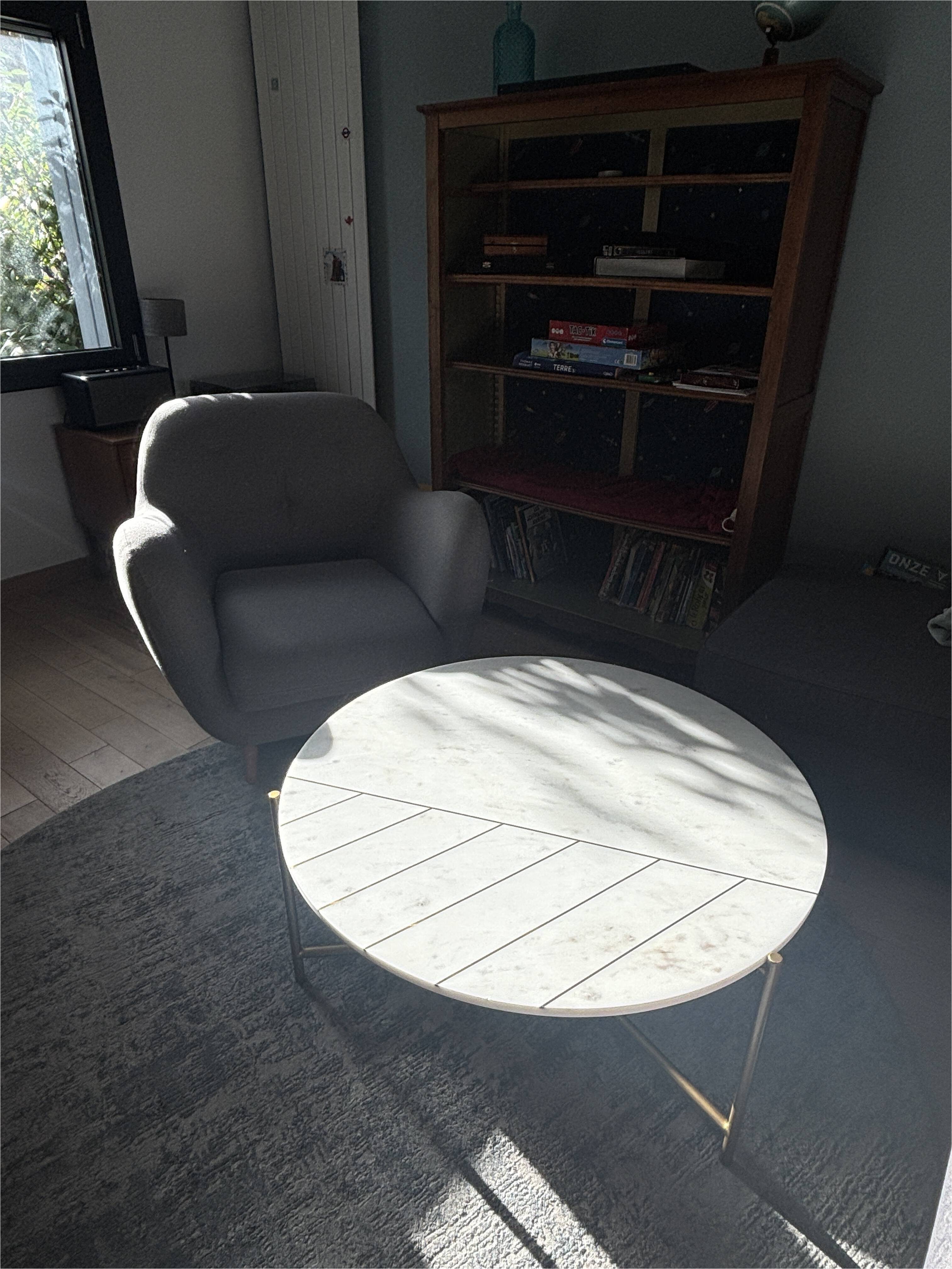 Les dimensions généreuses de cette table basse ronde permettent d'aménager un véritable espace convivial dans le salon tout en donnant un style affirmé à la pièce. On l'accompagne d'un canapé design et d'un fauteuil contemporain pour un séjour chic et tendance.
