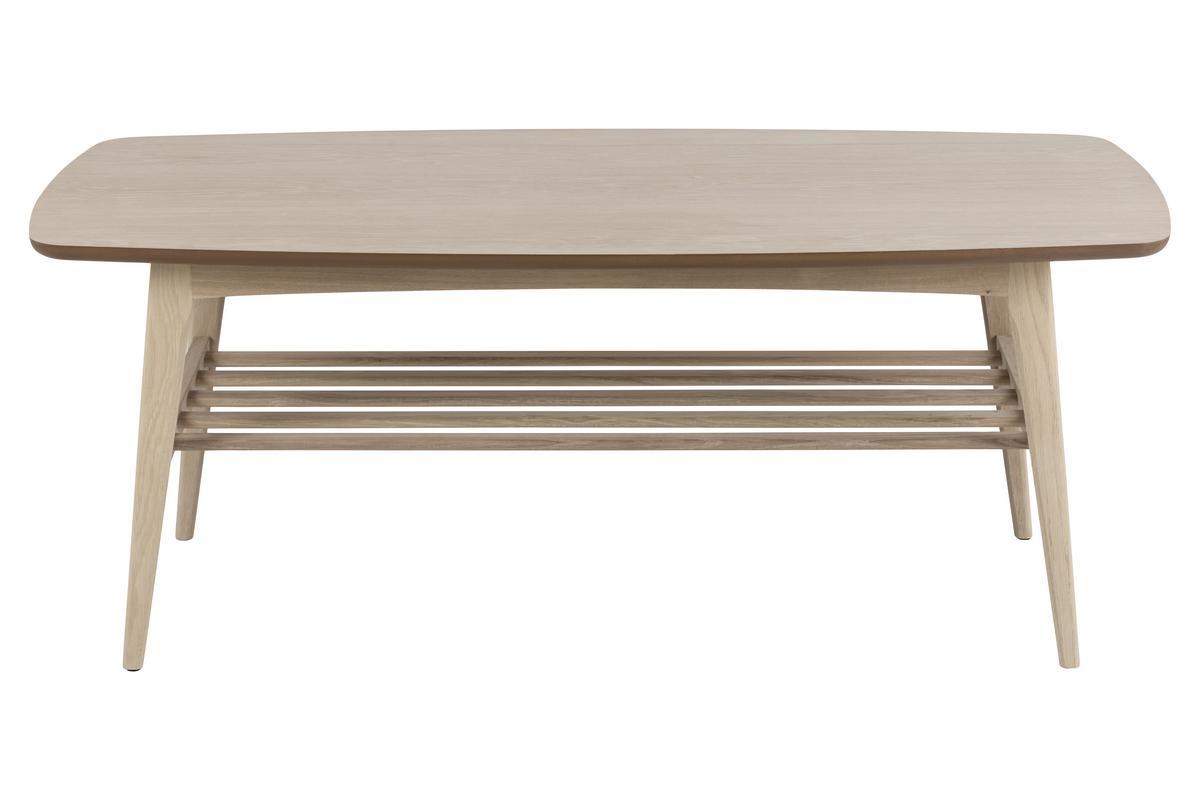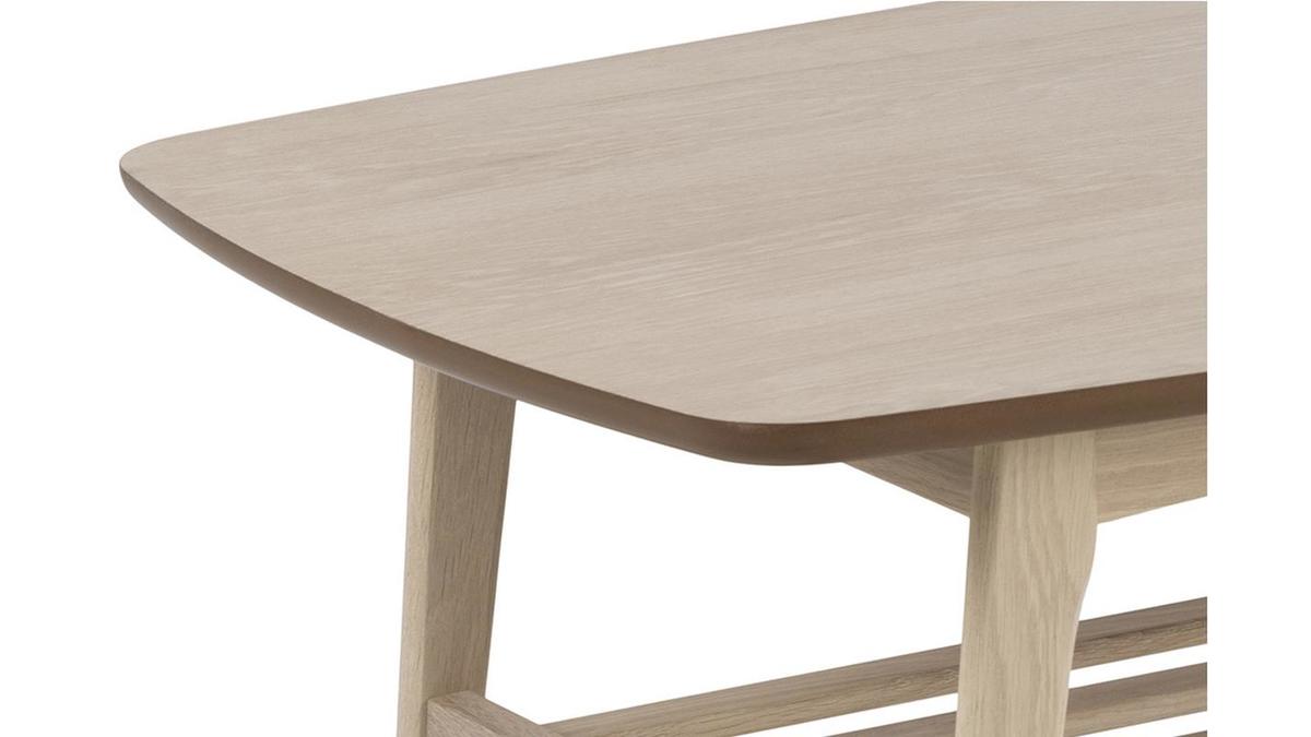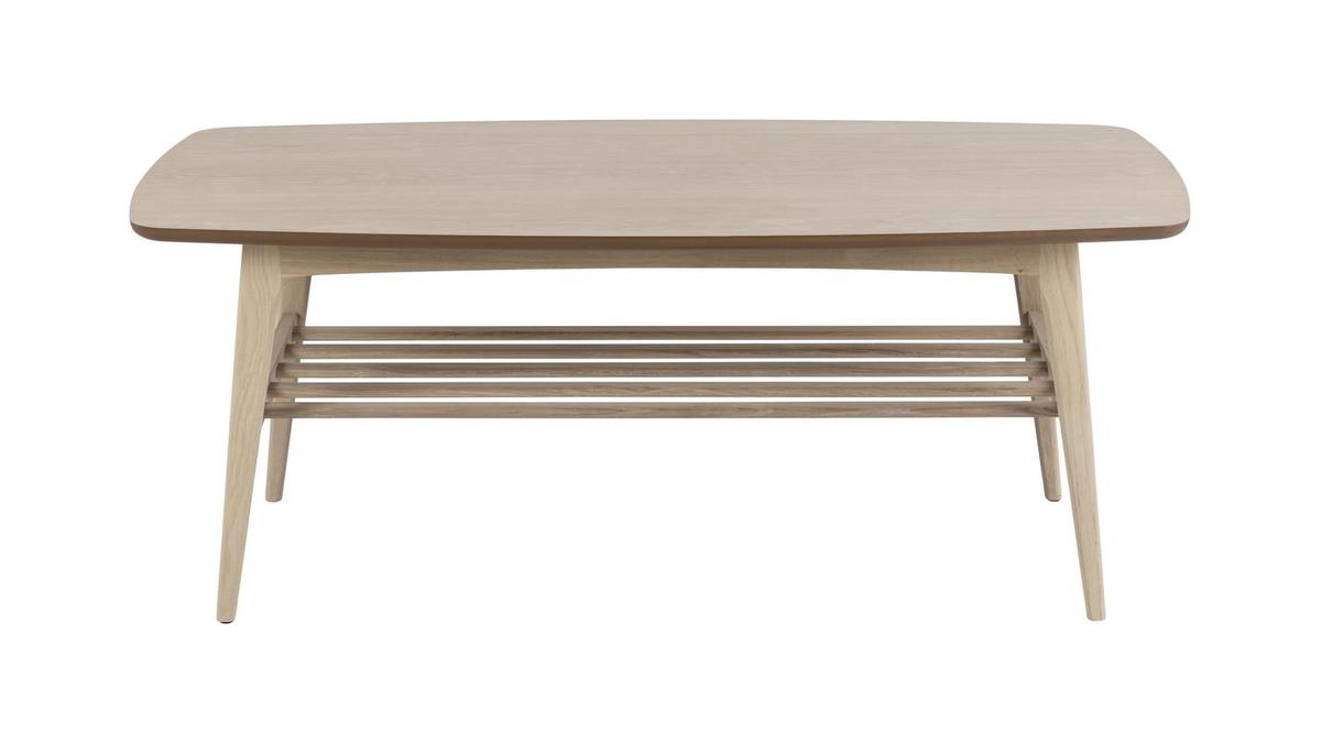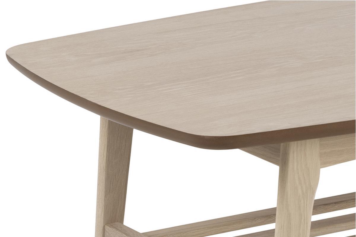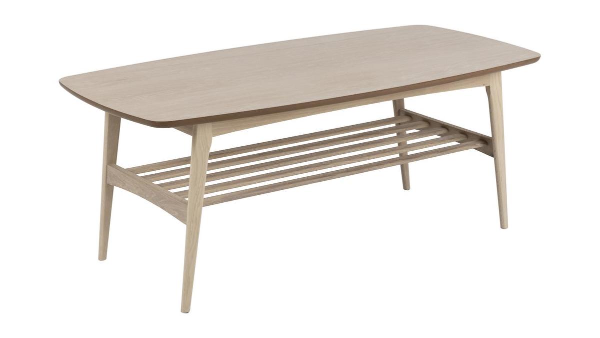 Cette grande table basse bois clair (L120 x P60 x H47 cm) s'intègre avec charme et naturel dans nos intérieurs. Son plateau aux angles arrondis est réalisé à partir de panneaux de fibres de bois placage chêne. On aime particulièrement sa finition naturelle composée d'une huile pigmentée blanc mat qui nourrit et protège le bois. Le piètement ainsi que les barreaux qui forment l'étagère inférieure sont en chêne massif.