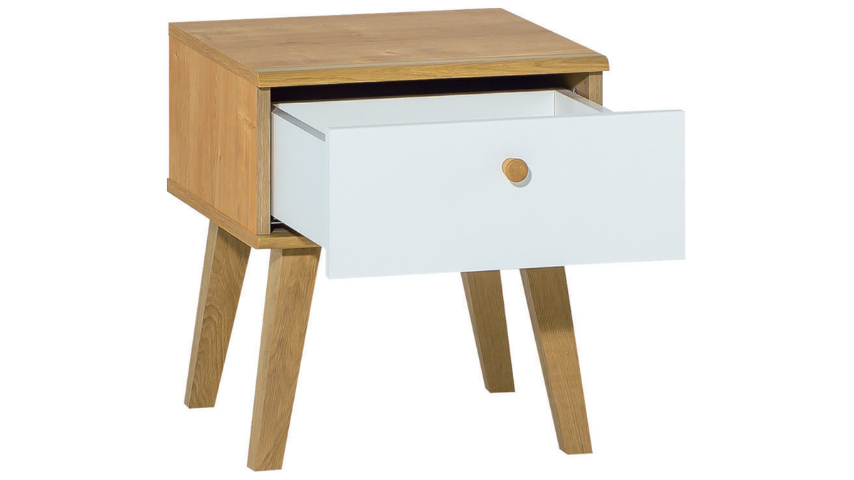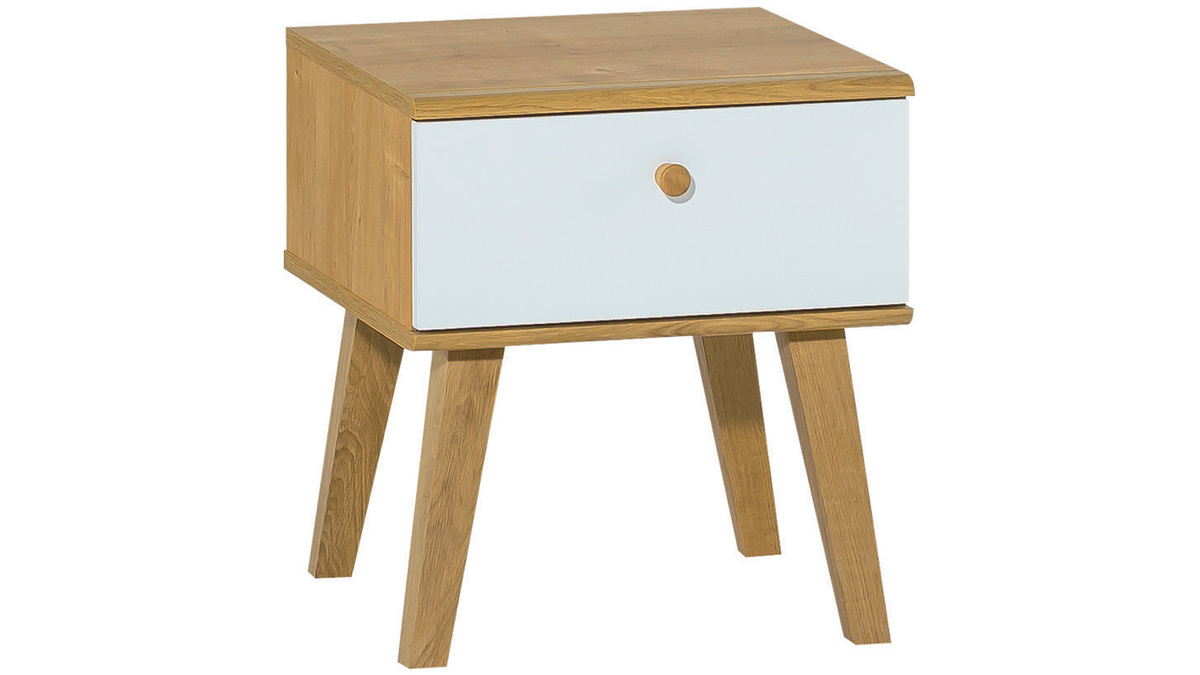 Ce petit chevet possède tout ce qui fait le charme des pièces en bois. La forme du modèle MAHE reprend les codes des chevets classiques donnant à l'ensemble un petit côté rétro. Son piètement en chêne massif, son plateau en panneaux de fibres de bois au placage assorti et son tiroir blanc offrent un rendu naturel et chaleureux. Cette table de chevet est un retour à l'essentiel pour un espace nuit qui fait la part belle à l'authenticité.