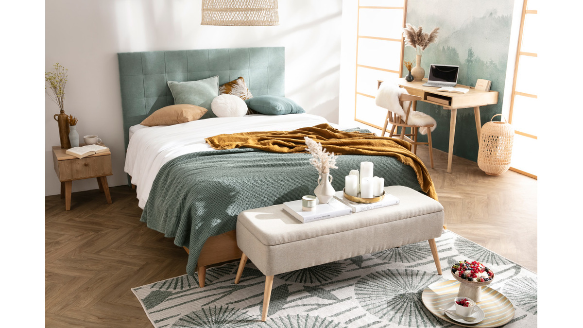 Pour une chambre authentique et cosy, on marie ce petit chevet à une tête de lit en tissu naturel.