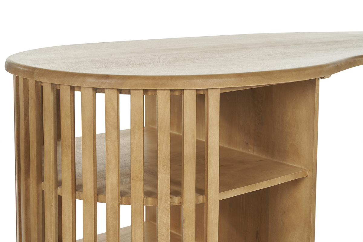 Table de bar avec rangements en bois manguier massif H90 cm LOBIO livrée prête à assembler. Montage simple, seul le piètement est à fixer au plateau.