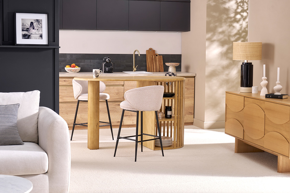 Moderne, japandi, scandinave, bohème ou ethnique, LOBIO et sa facture unique s'envisagent dans de nombreux styles d'intérieur. En tissu et métal pour contraster du bois, des tabourets de bar design H70 cm habilleront avec le plus bel effet cette table de bar hauteur plateau H90 cm.