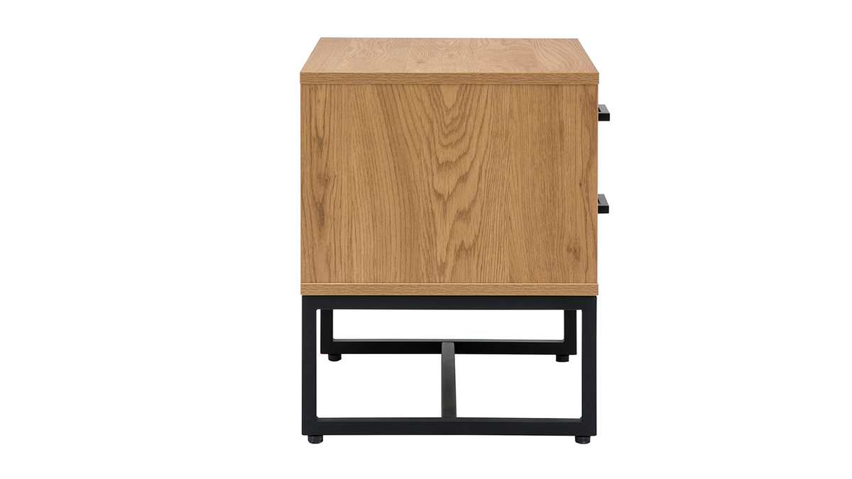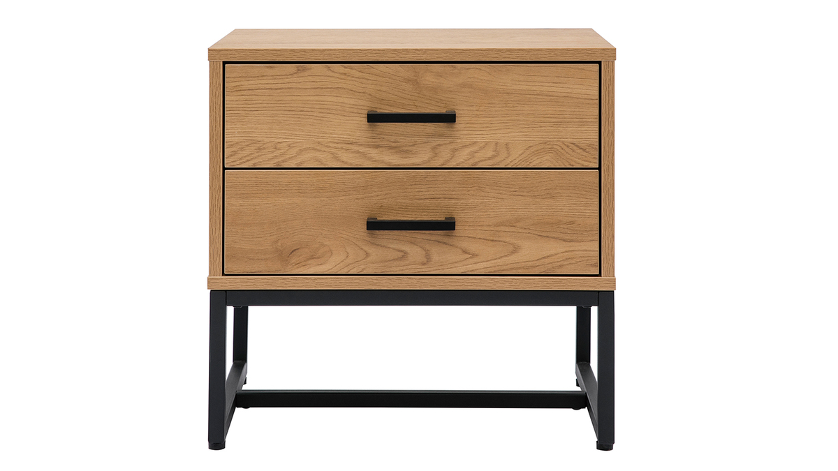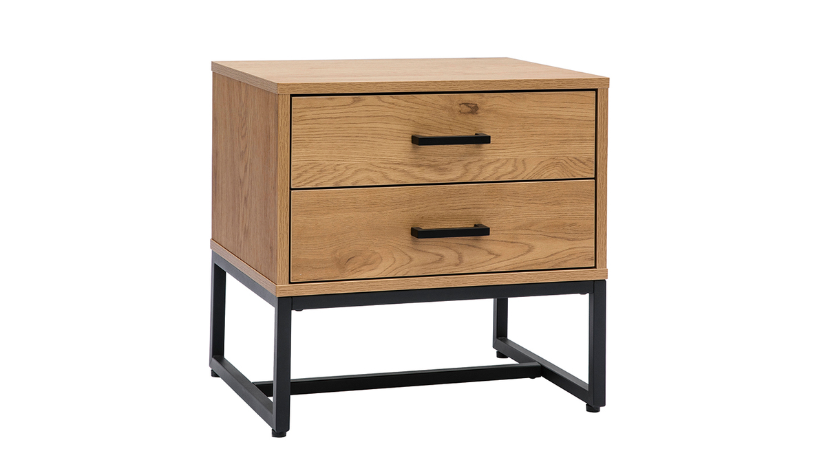 Ce chevet mêle le caractère authentique du bois et le langage contemporain du métal. La base métallique aérienne supporte une structure en panneaux de particule de bois finition chêne (mélamine) aux noeuds et veines marqués.