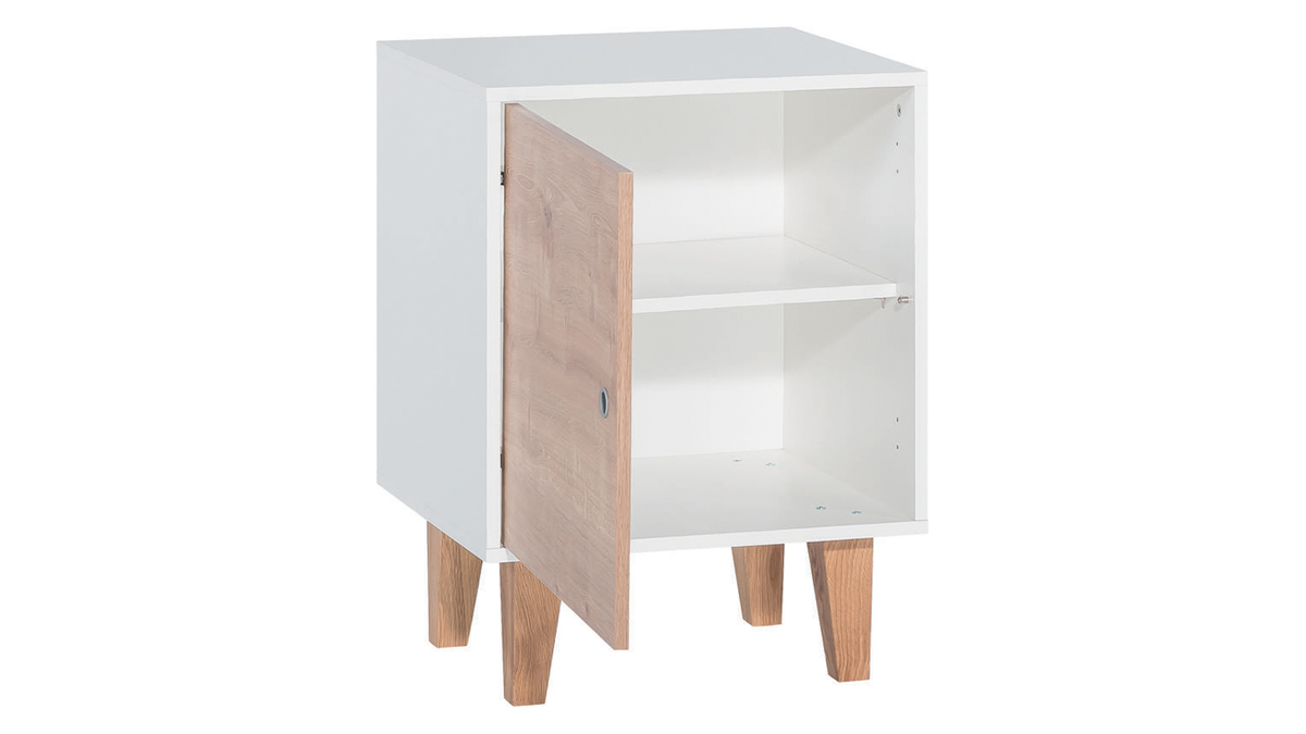 D'inspiration scandinave, elle allie à la perfection un piètement compas en chêne massif à un caisson blanc avec effet chêne. L'ensemble forme un meuble épuré et chaleureux, tout en modernité. Cette table de chevet bois et blanc contribuera grandement à réchauffer l'ambiance de votre chambre !