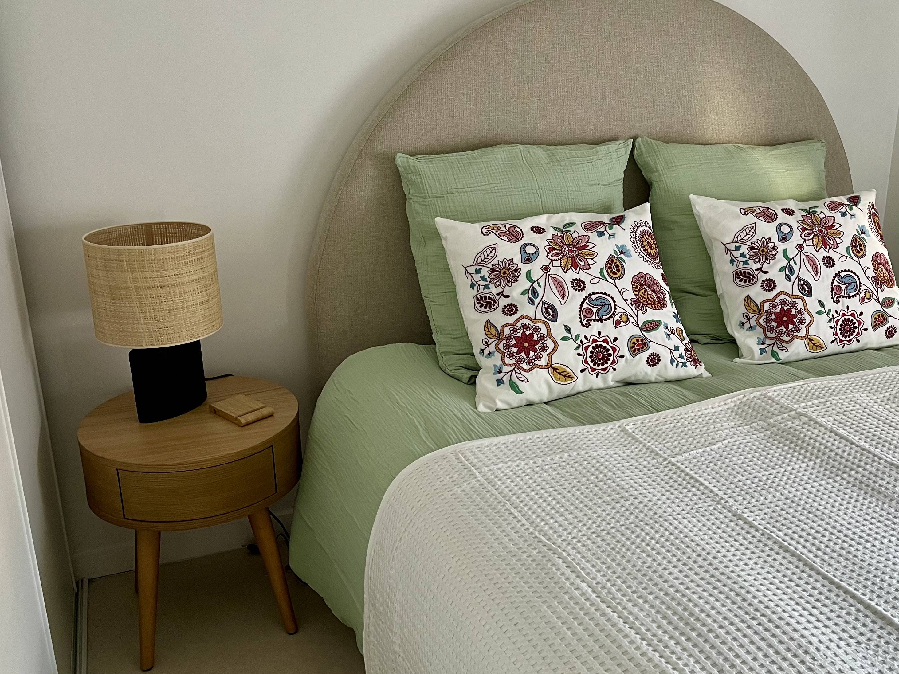 De chaque côté d'une tête de lit en velours, en tissu, en rotin, ou en bois, on aime la manière dont cette petite table de chevet ronde sublime la chambre et lui donne beaucoup d'allure. En plus de ponctuer joliment la déco de votre cocon, on adore son tiroir discret qui apporte un espace de rangement supplémentaire dans la chambre à coucher.