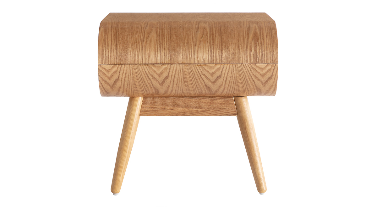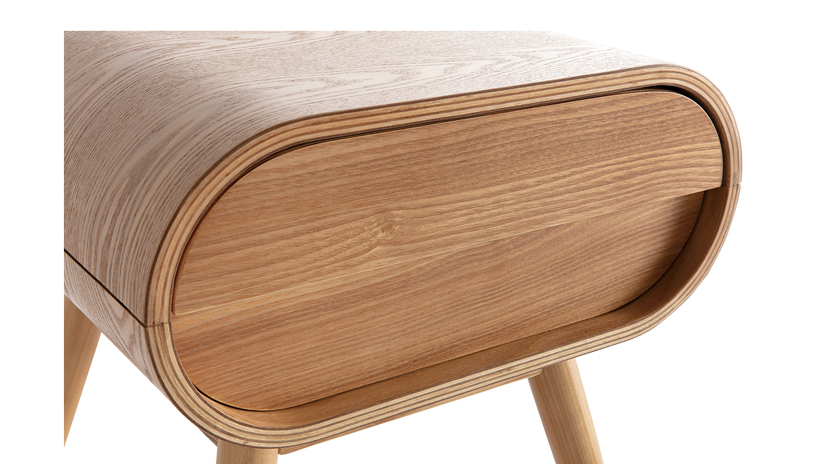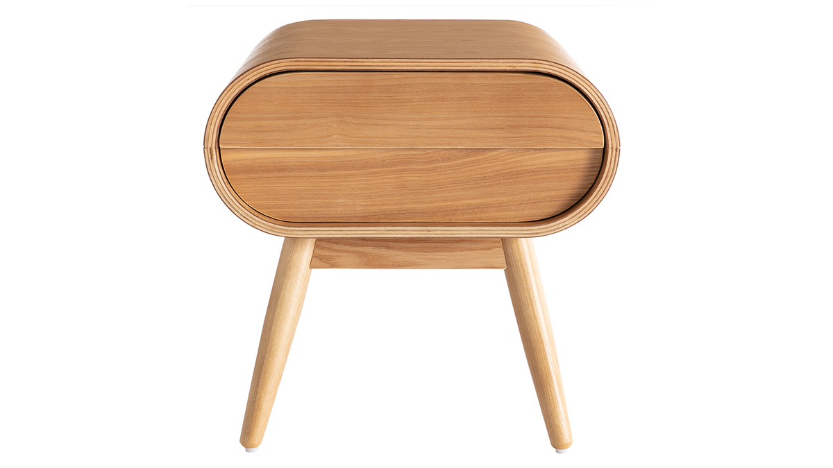 Tout en arrondie, cette table de chevet fabriquée en contreplaqué avec un piètement en hévéa, possède un placage en frêne. De style rétro-scandinave, cette table de chevet en bois sera parfaite accompagnée d'un lit en bois !