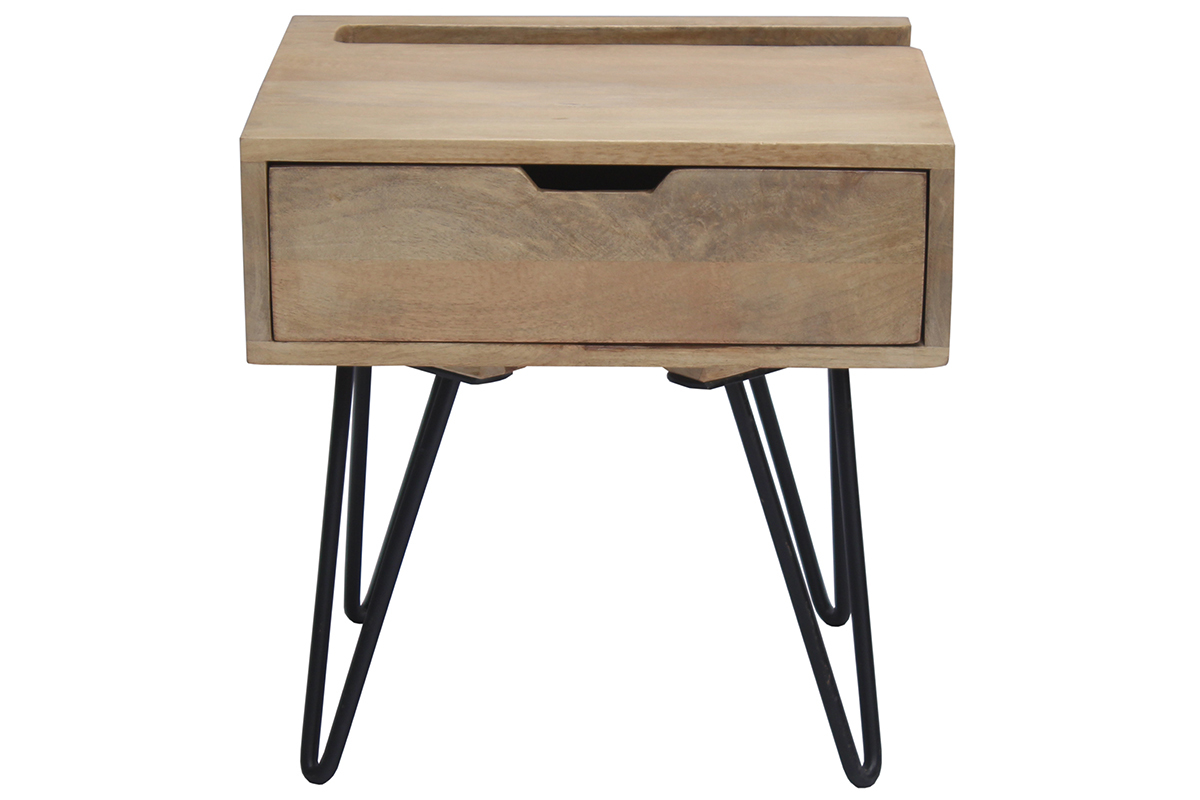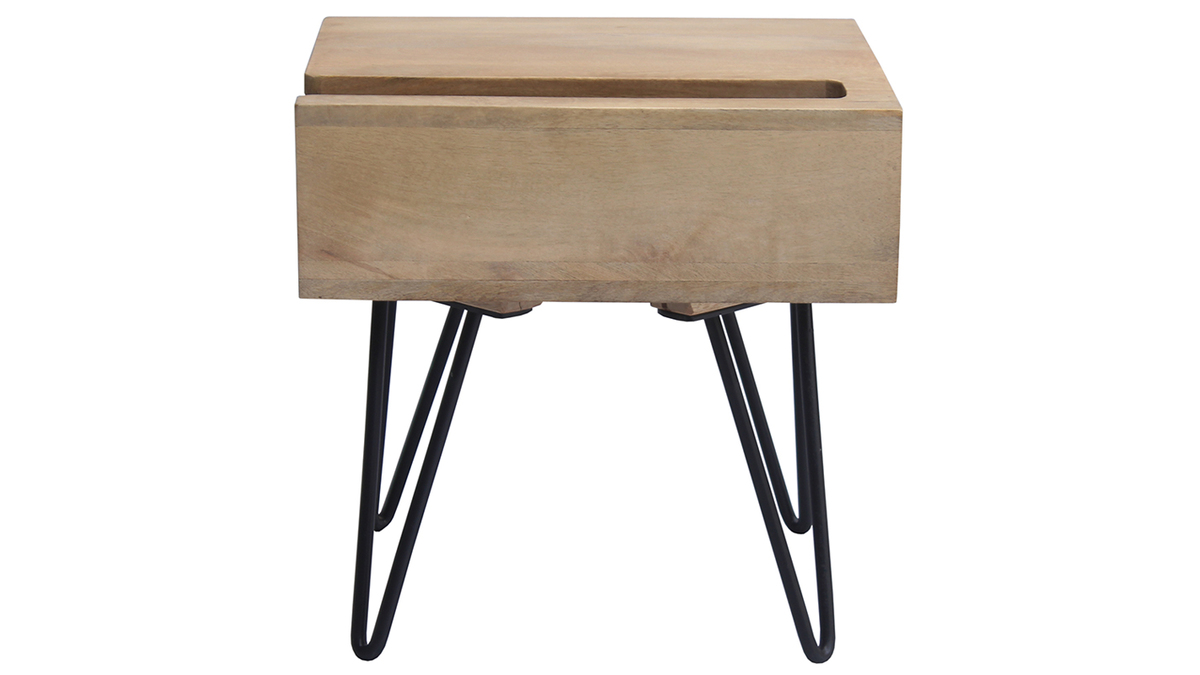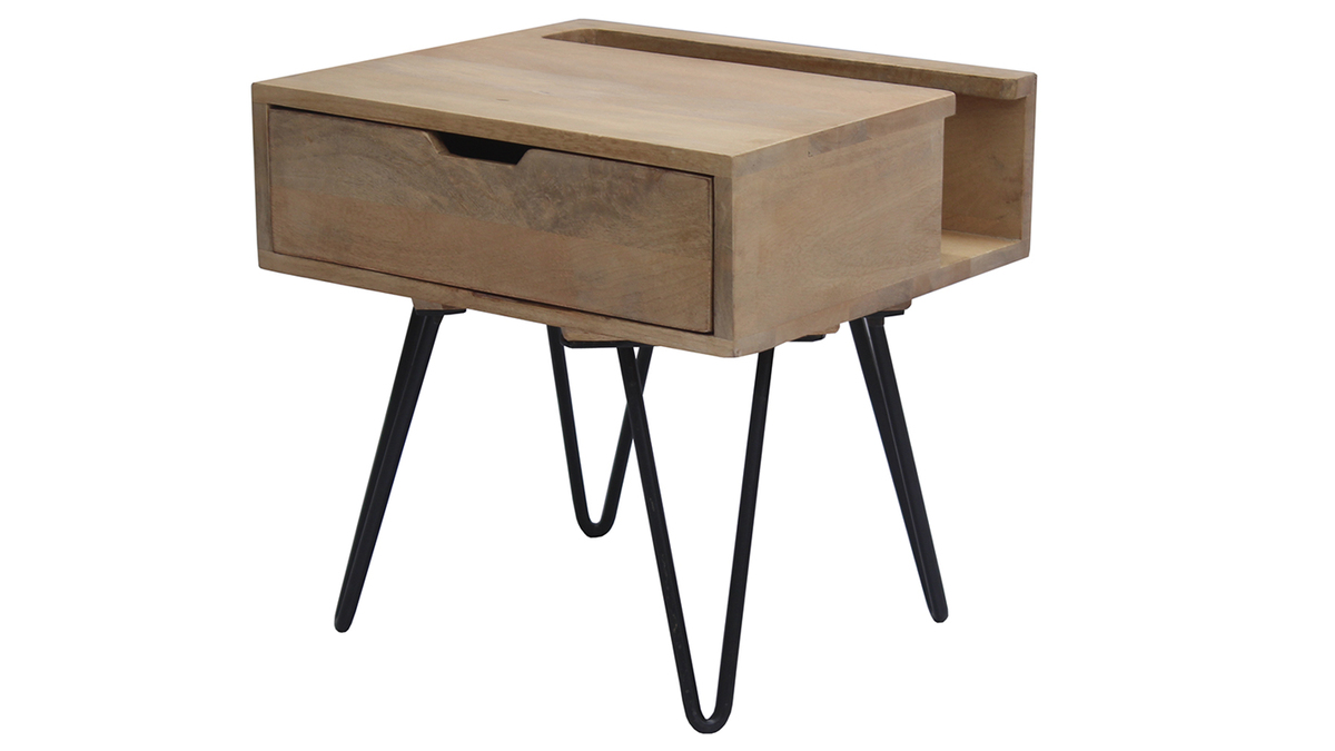 Ses dimensions (L45 x P40 cm) en font un meuble idéal pour organiser une petite chambre. Si ce chevet est un meuble fonctionnel, il ne manque pas non plus de charme. Il est conçu en manguier et en métal noir de façon artisanale. Cette essence de bois possède différents détails et nuances qui offrent un rendu authentique unique. Le piètement métallique en épingle apporte, quant à lui, solidité, stabilité et légèreté à cette table de chevet en bois massif.