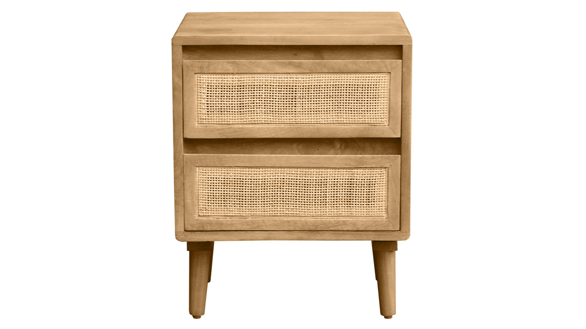Synthèse réussie d'une structure en manguier massif et d'un cannage rotin pour habiller les façades de tiroirs, la table de chevet ACANGE se distingue par son naturel.