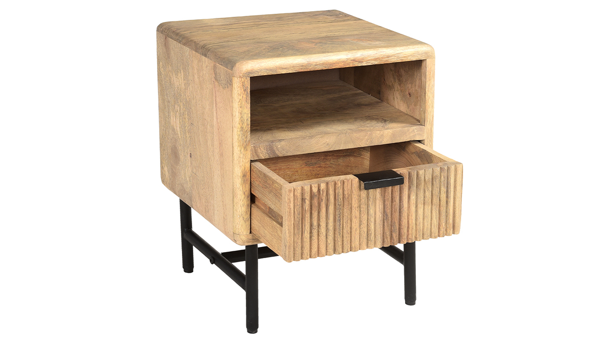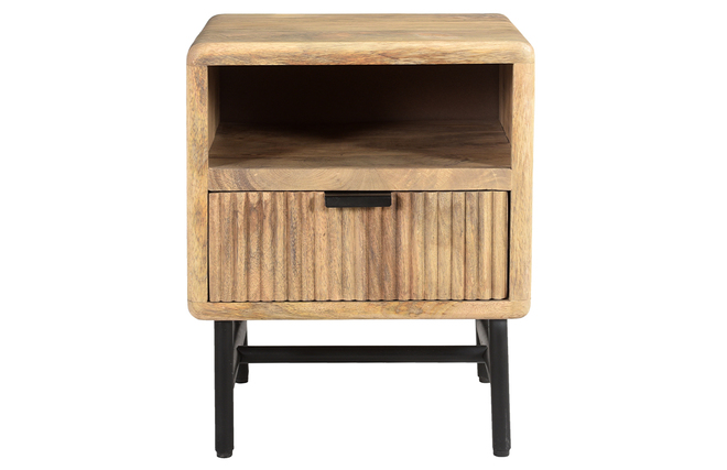 Subtilement, le piètement tubulaire en métal noir apporte une touche de modernité et de légèreté au caisson en manguier massif. Lumineuse, cette essence de bois exotique fait partie de ces matériaux durables dont on ne vante plus les mérites en termes de robustesse et d'esthétisme. Les gravures verticales signent avec originalité la façade du tiroir et donnent du rythme à l'ensemble. À la fois graphique et authentique, on imagine cette table de chevet en bois massif (fond du meuble en panneaux de fibres de bois) réchauffer un intérieur aux accents ethnique chic. Dans une ambiance tropicale sur fond d'imprimés feuilles de palme et oiseaux du paradis, elle sera du plus bel effet !