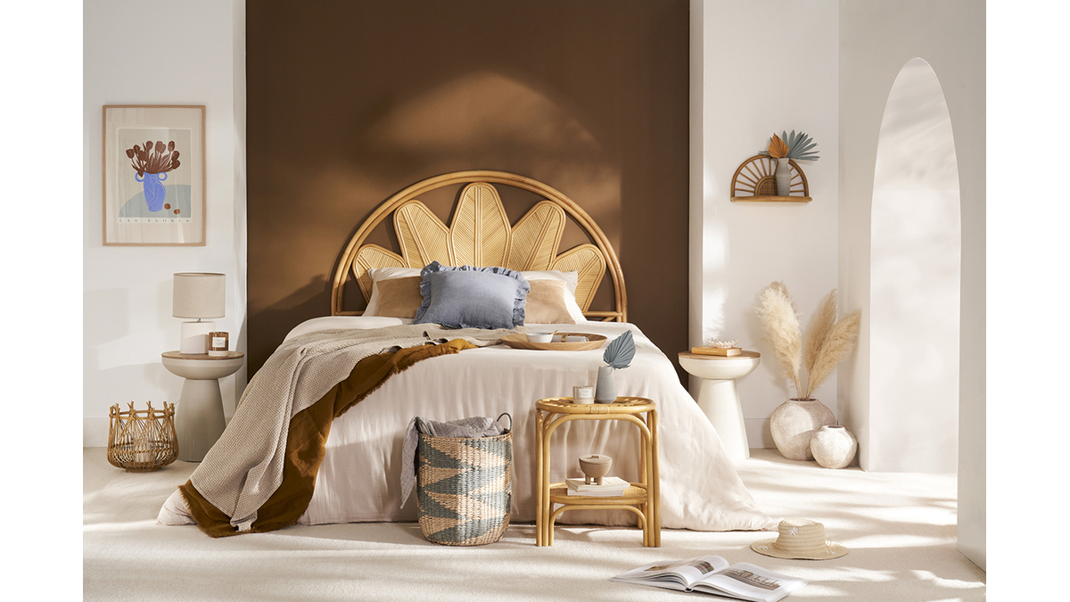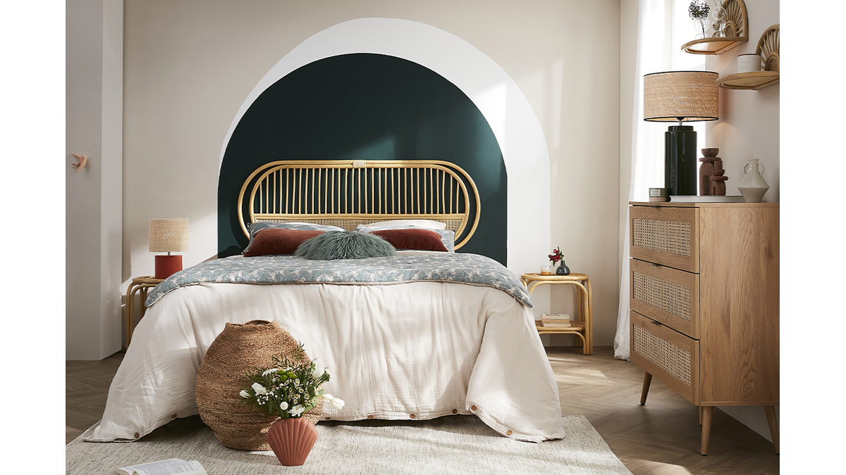 Placée de chaque côté du lit, ce meuble artisanal en rotin mettra parfaitement en valeur l'espace nuit. Envie de voyager sans quitter votre nid douillet ? Créez le combo parfait en mariant cette table de chevet à la tête de lit assortie !