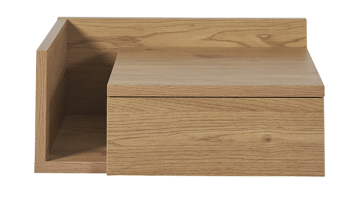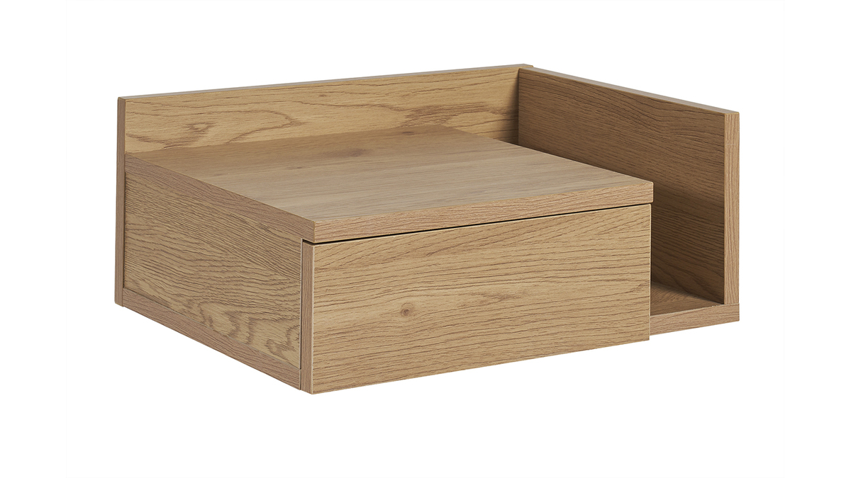 Véritable atout fonctionnel, aussi esthétique que pratique, ce rangement mural fabriqué à partir de panneaux de fibres de bois finition chêne clair, dispose d'une solution de montage double qui permet de placer le rangement latéral, à droite ou à gauche du caisson central. Voilà une table de nuit suspendue et réversible qui s'adapte à la disposition de votre pièce et à ses utilisateurs !