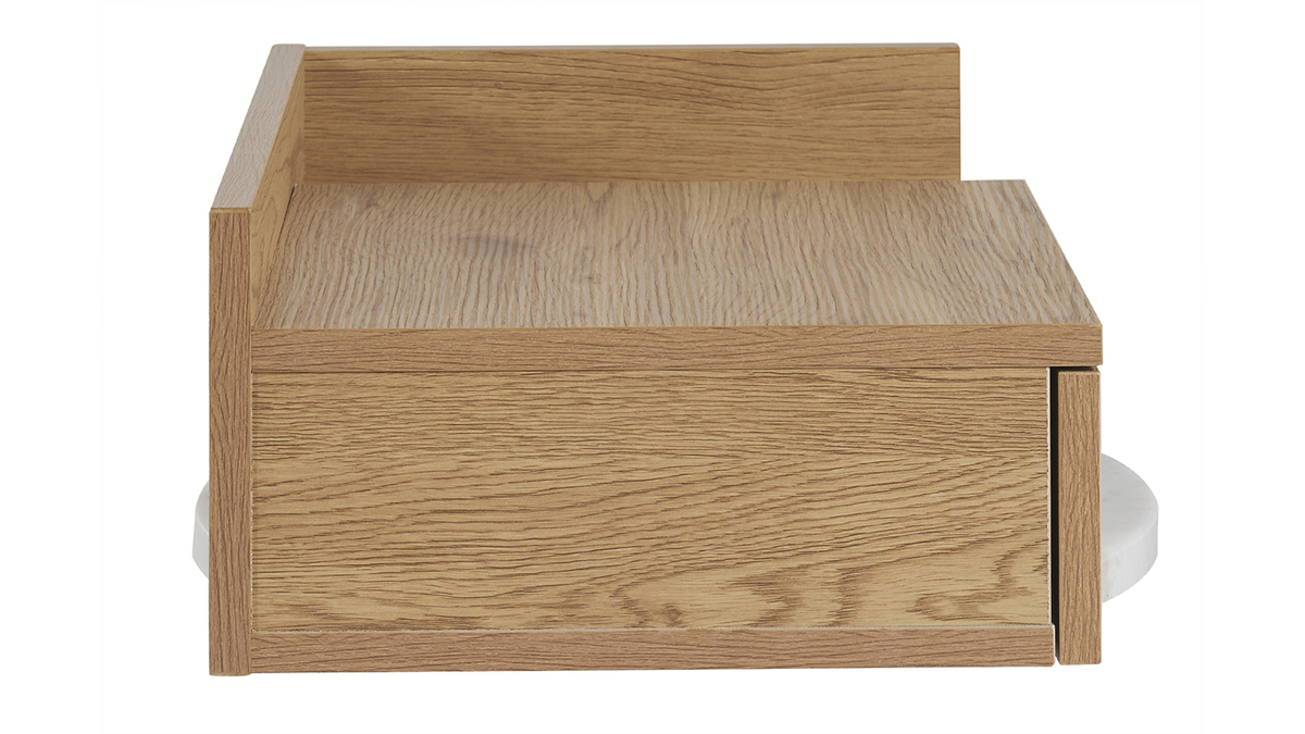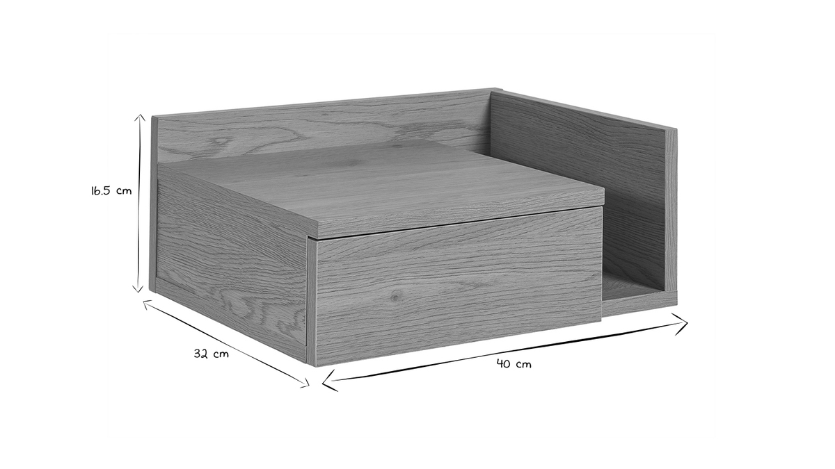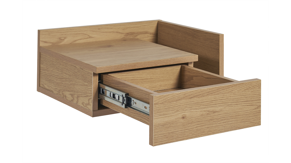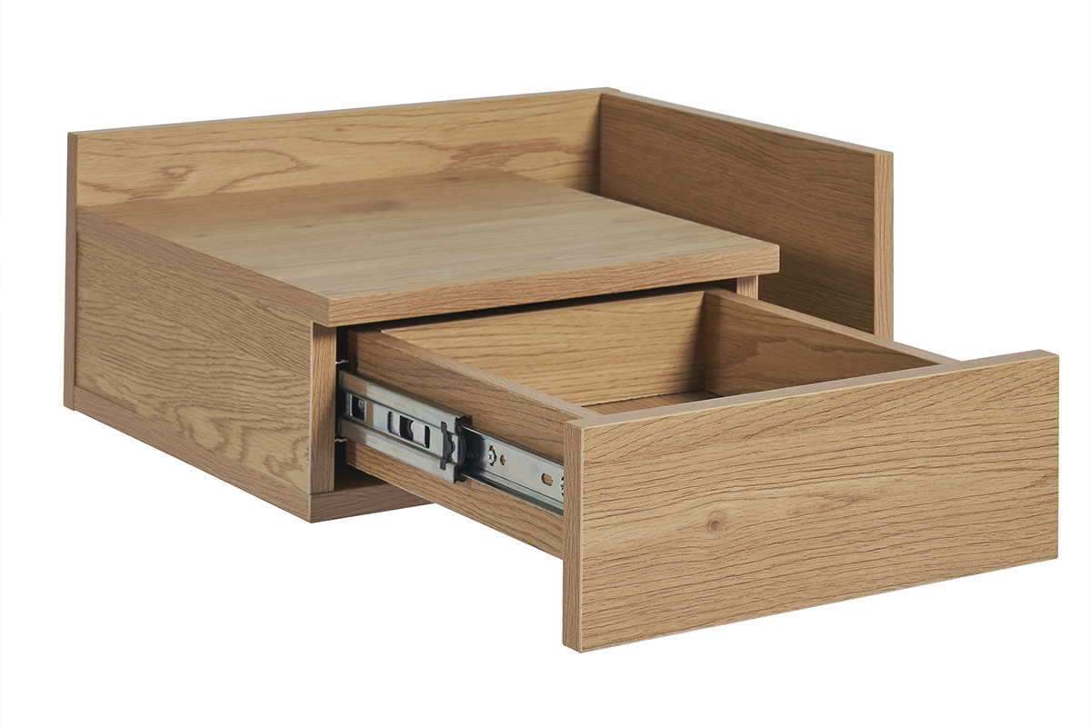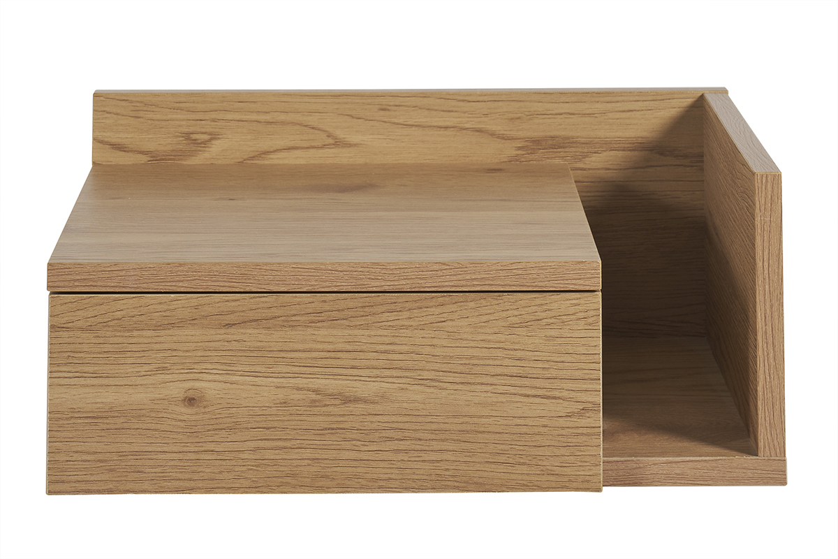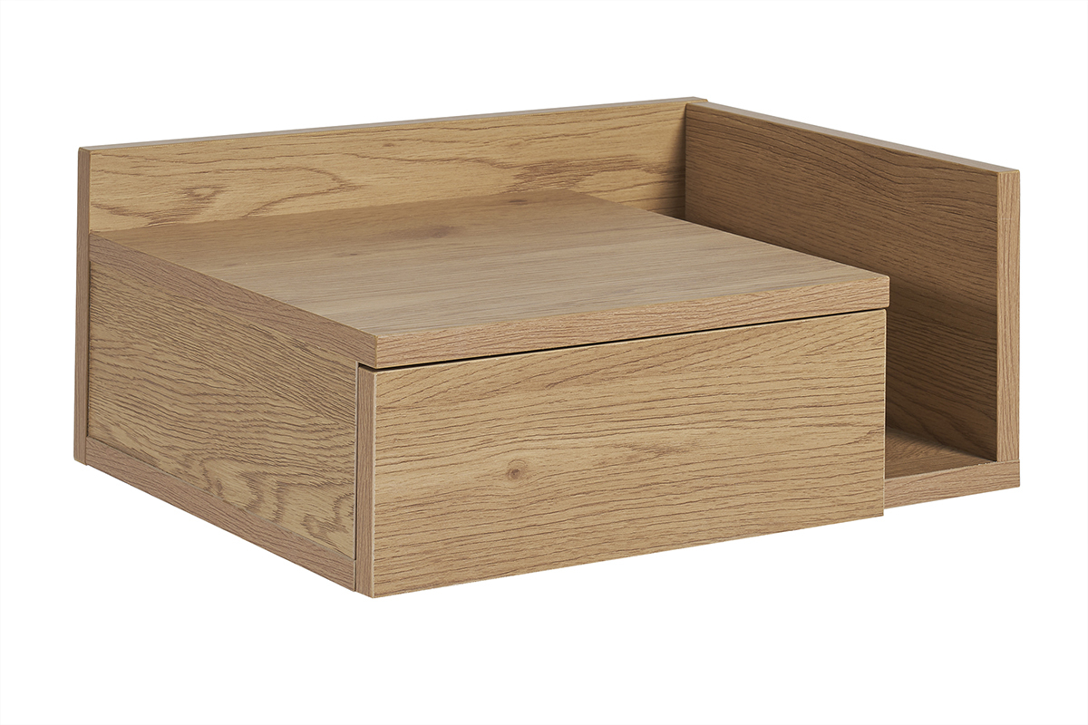 Conçue en deux parties, cette table de chevet à suspendre effet bois clair (dimensions L40 x P32 x H16.5 cm) se compose d'un tiroir (L21.5 x P23.5 x H5.5 cm) et d'une niche ouverte (L8.5 x P28.5 x H10.5-15 cm). Parfait pour garder à portée de main une lecture, des lunettes, un réveil et tous vos indispensables avant le coucher et au réveil !