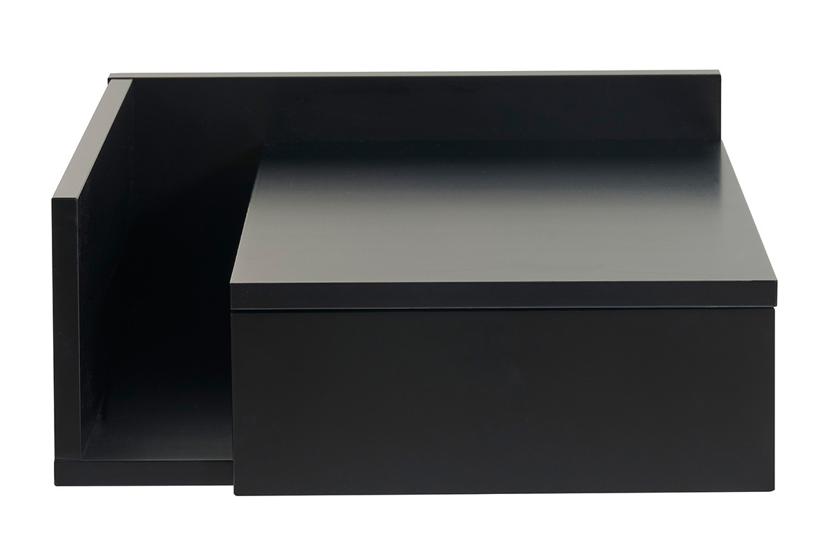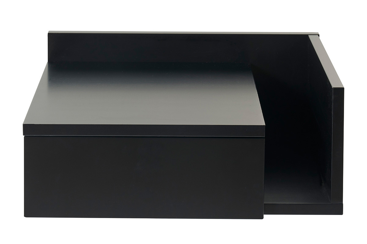 Conçue en deux parties, cette table de chevet à suspendre noire (dimensions L40 x P32 x H16.5 cm) se compose d'un tiroir (L21.5 x P23.5 x H5.5 cm) et d'une niche ouverte (L8.5 xP28.5 x H10.5-15 cm). Parfait pour garder à portée de main une lecture, des lunettes, un réveil et tous vos indispensables avant le coucher et au réveil !