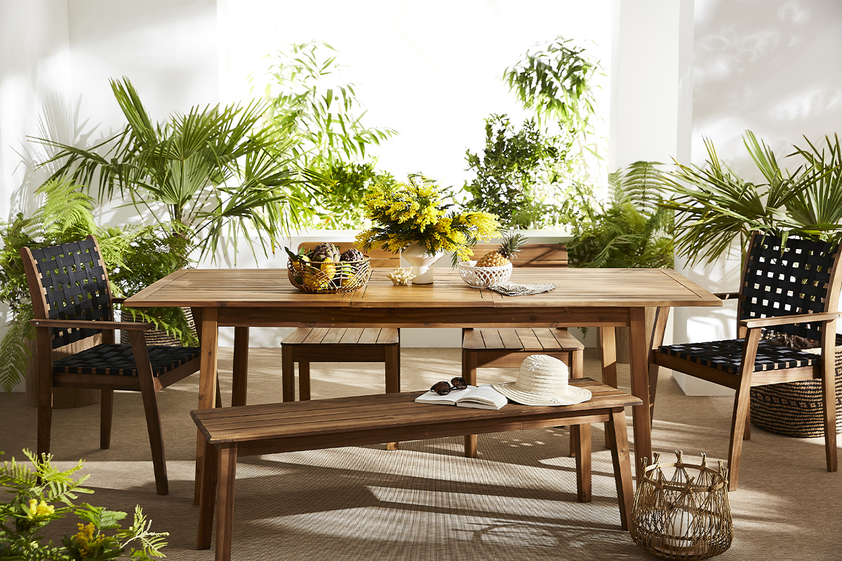 L'acacia est une essence naturellement dure et dense qui a une bonne résistance à l'humidité. Pour faire face aux UV, intempéries et moisissures, la structure en acacia est enduite d'une huile protectrice. Le bois a tendance à prendre une teinte grise avec le temps. Celle-ci n'altère en rien ses propriétés. Il est néanmoins recommandé de nourrir et protéger votre meuble de jardin pour qu'il garde sa splendeur dans le temps en appliquant une huile adaptée au mobilier d'extérieur que vous trouverez dans tous les magasins spécialisés.