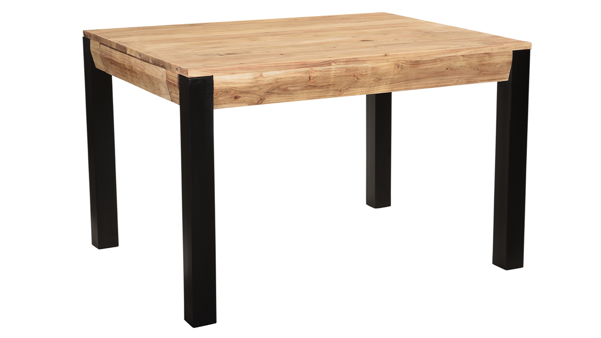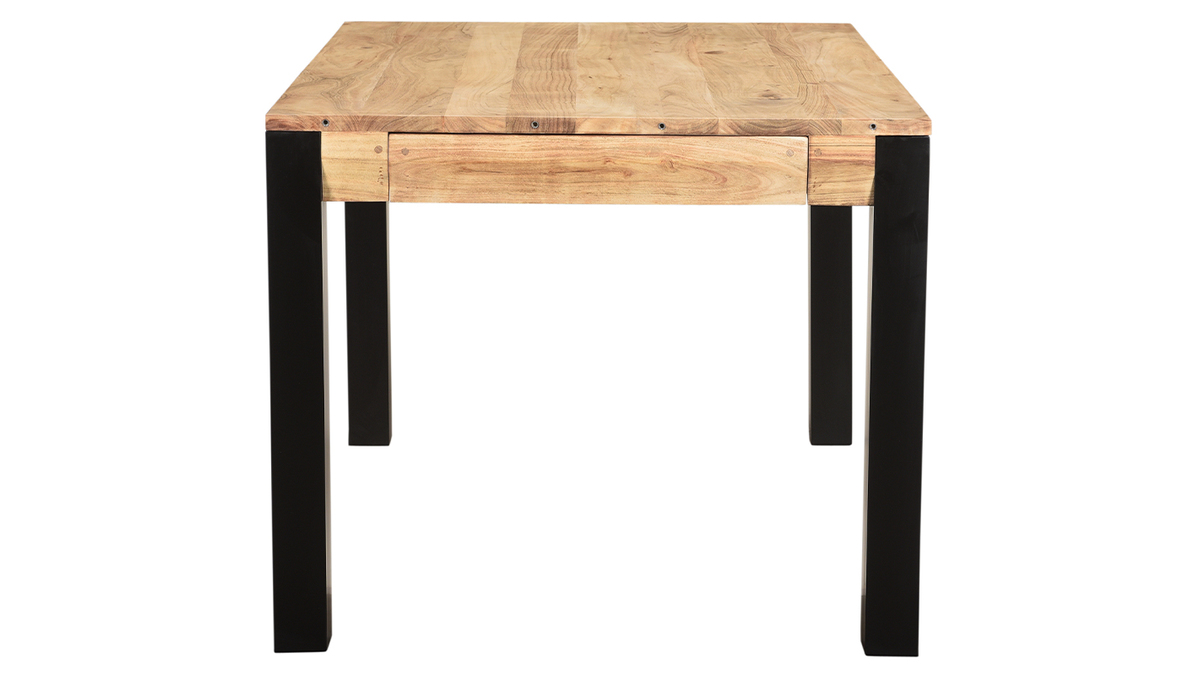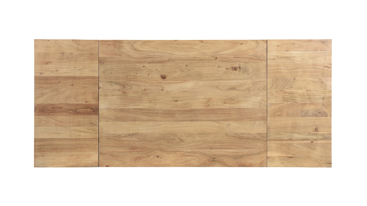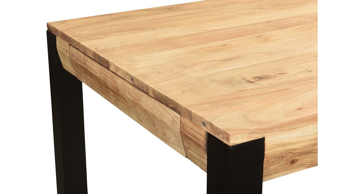 Table d'une qualité exceptionnelle. Rendu magnifique du plateau en bois d'accacia en accord parfait avec les 4 pieds robustes en acier noir!!! Une table pour toute la vie!!! De plus ces deux rallonges de 45 cm chacunes offre une extension qui nous amène a 210 cm. Faciles a deplier et très robustes On recommande . Pas d'entretien juste un chiffon humide et voilà pour le nettoyage. Etre deux pour le montage car très lourde.