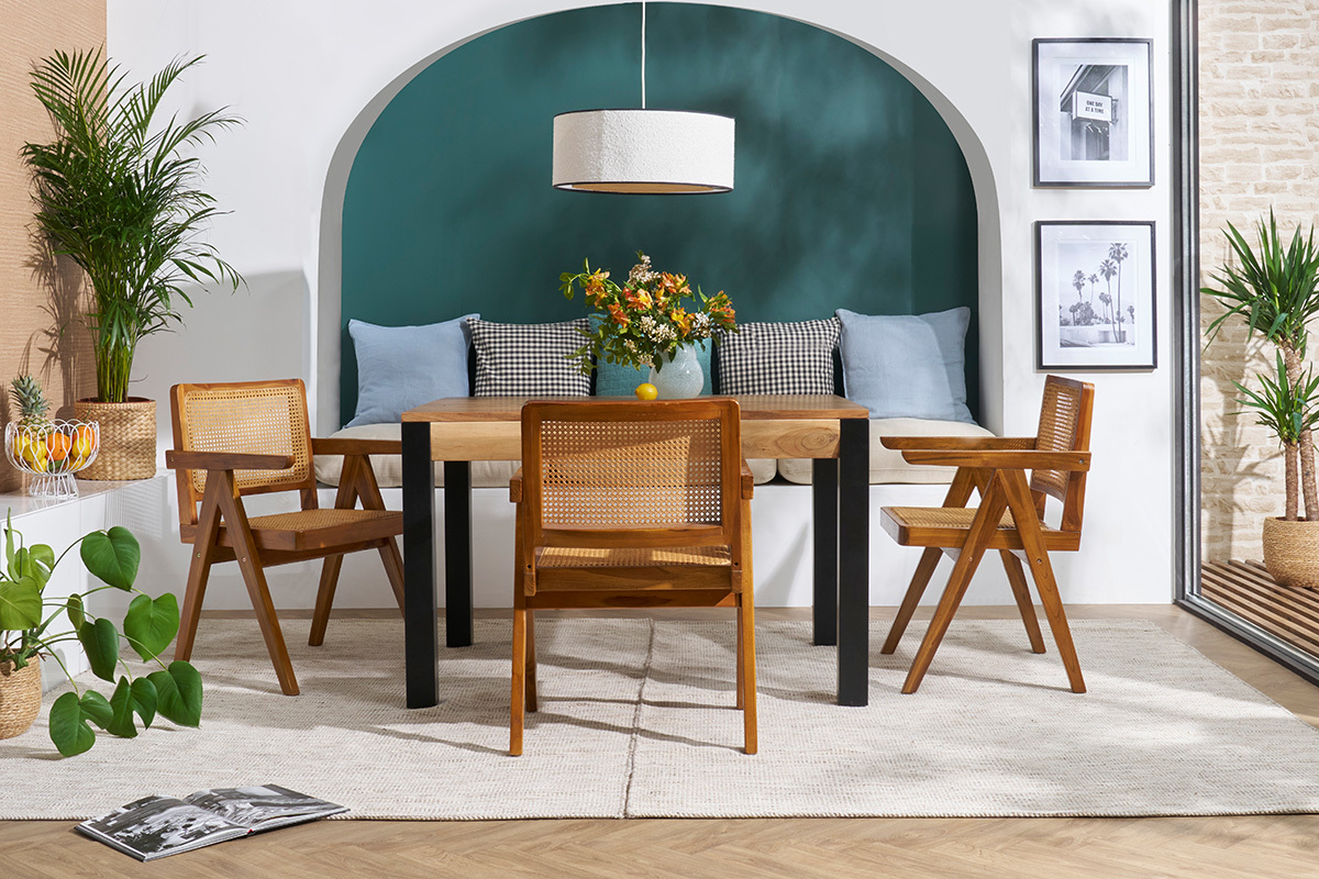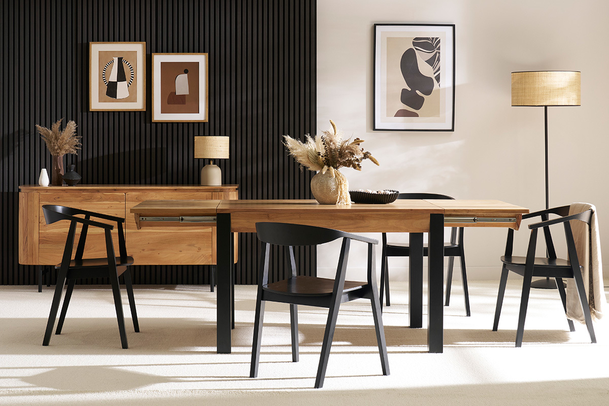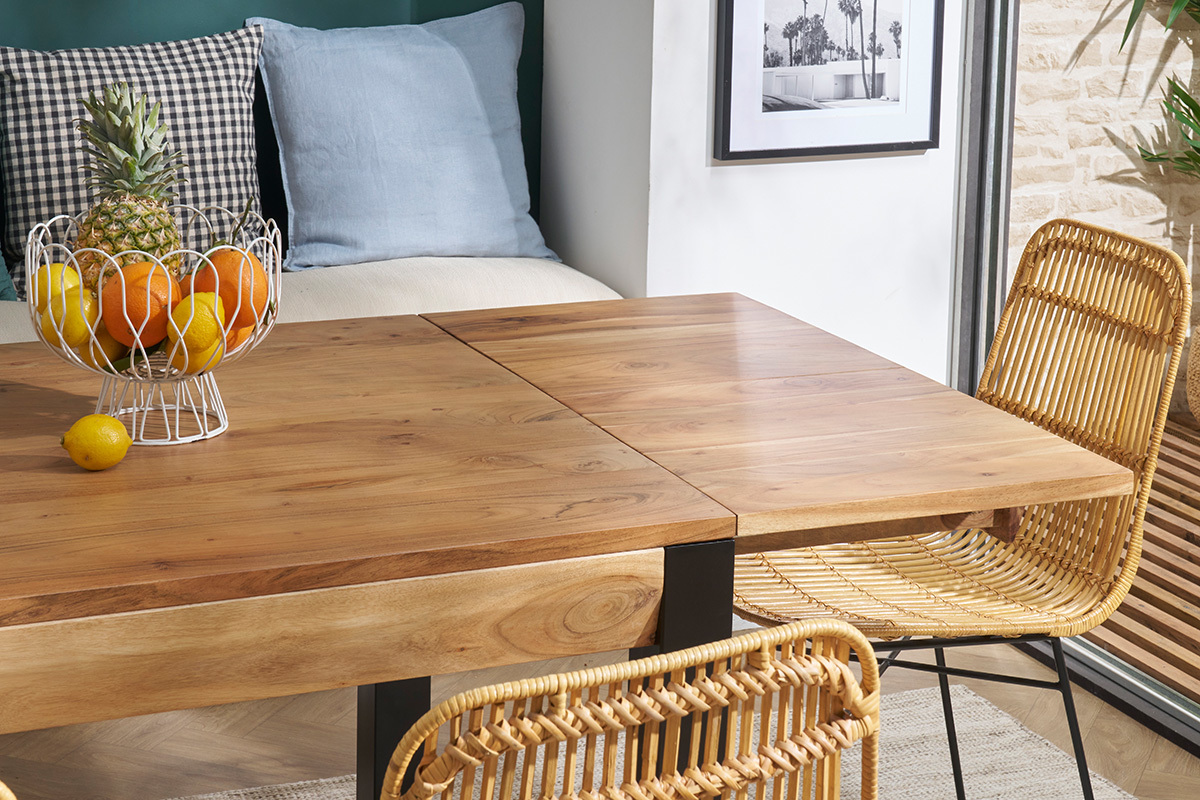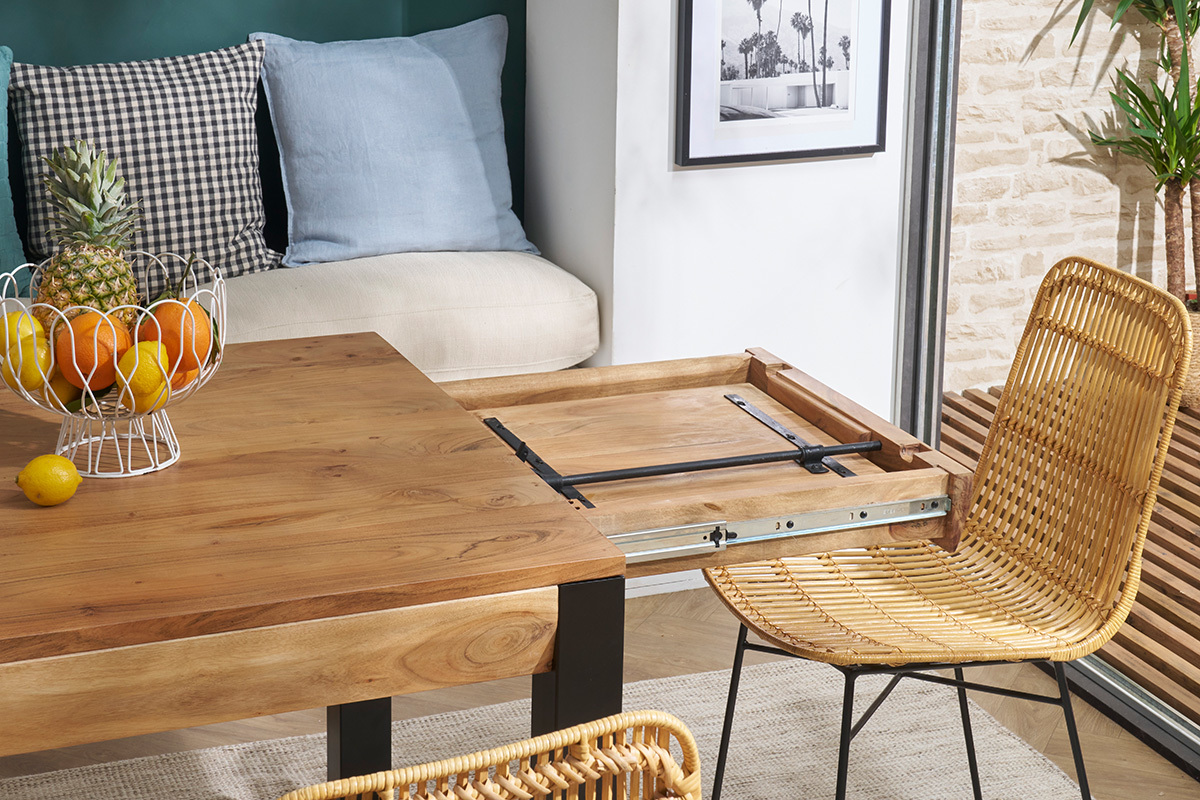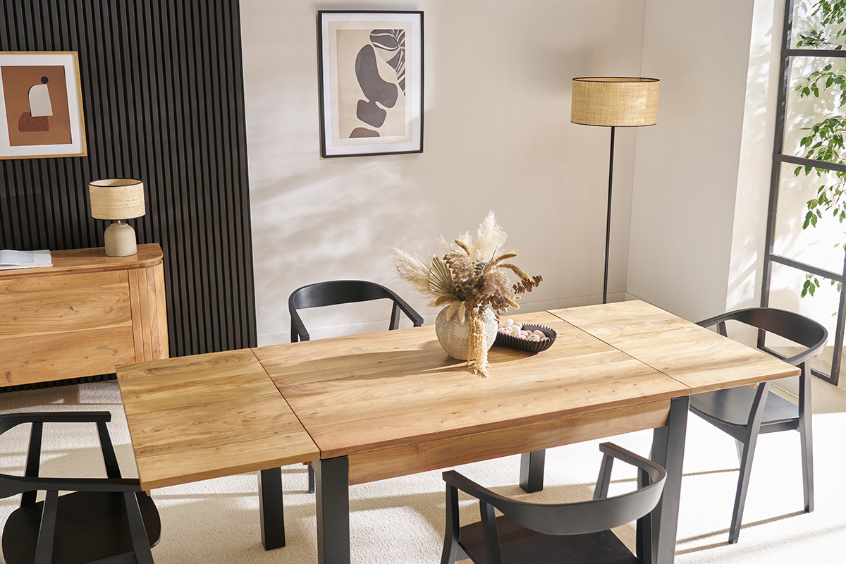 Robuste et stable, cette table extensible rectangulaire à rallonges intégrées en bois et métal 4 à 8 personnes est une belle pièce de mobilier créée pour accompagner de nombreux repas intimistes et moments conviviaux. On la complète avec des chaises design dépareillées pour une salle à manger aussi confortable que tendance !