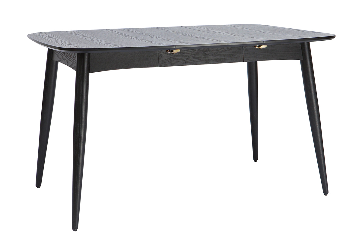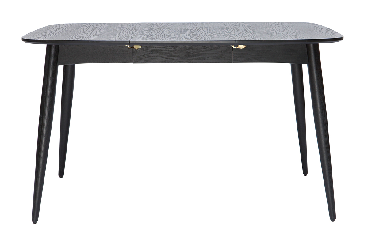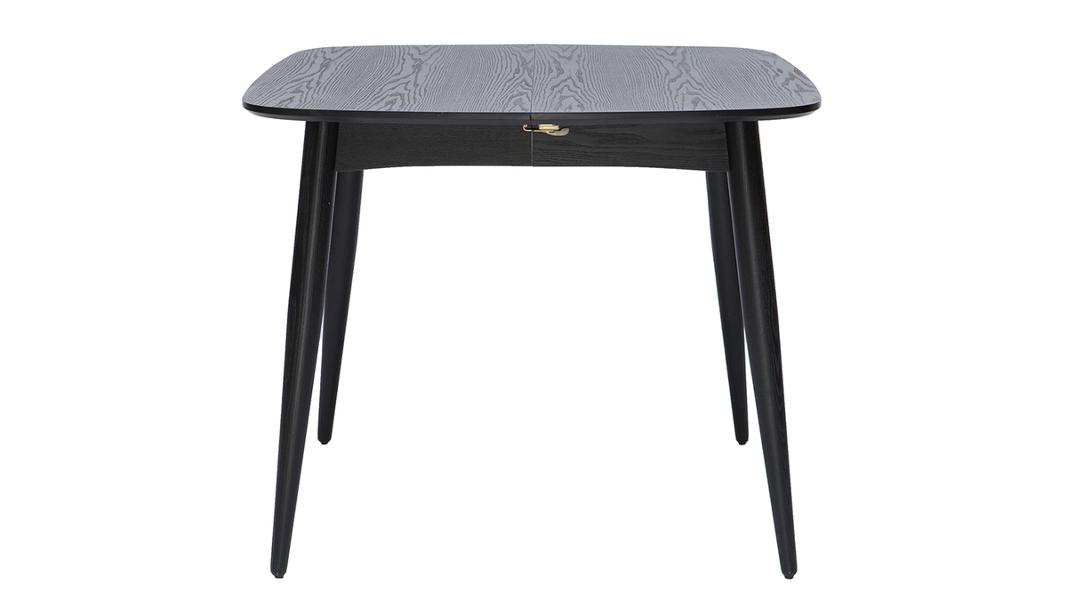 Table à manger extensible noire vue de face avec pieds effilés.