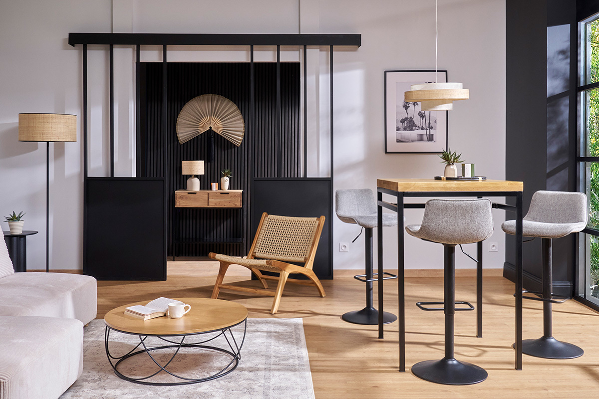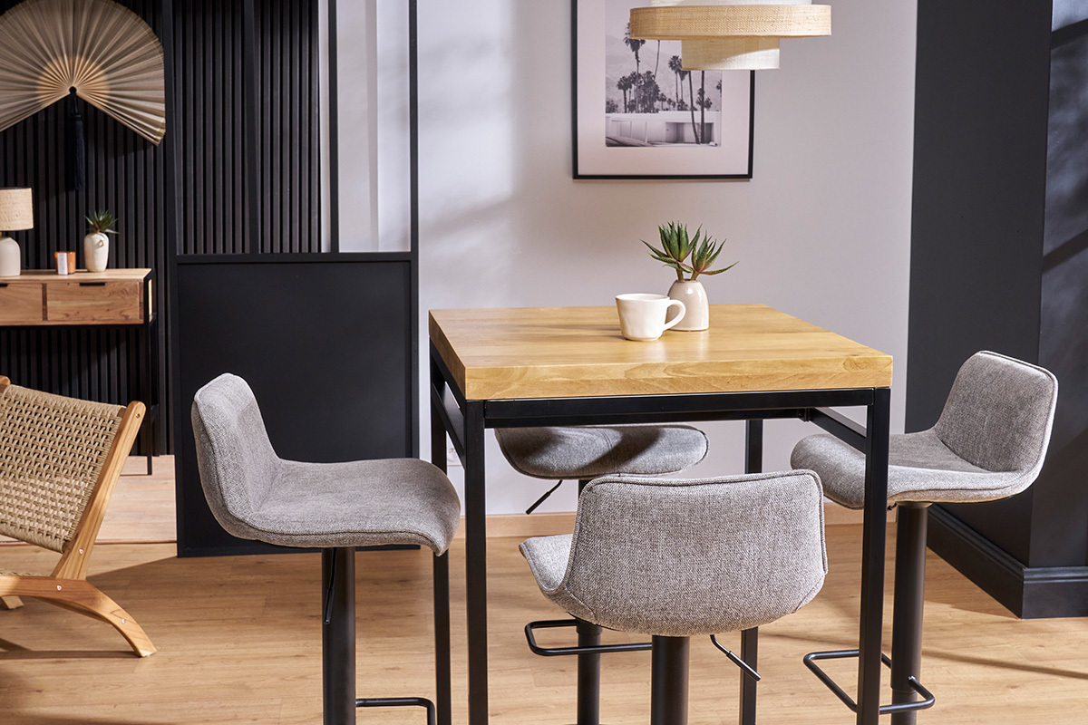 La table haute en bois massif YPSTER c'est aussi l'astuce gain de place par excellence. On peut facilement glisser des tabourets de bar industriels assortis sous le plateau ou l'utiliser comme mange-debout lorsqu'on reçoit. Son plateau carré de 70 cm est un format idéal pour manger à deux ou à quatre.