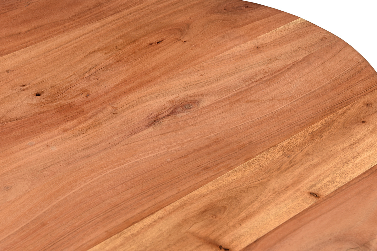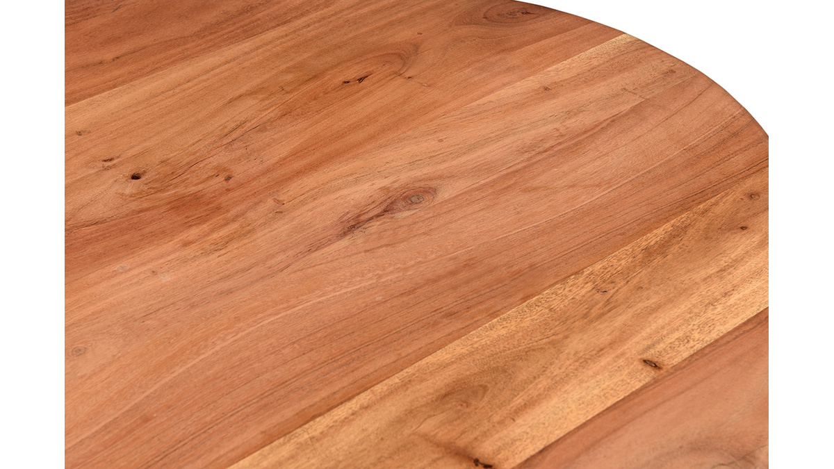 Plébiscitée pour la confection de mobilier d'intérieur, l'acacia est une essence naturellement dure et dense particulièrement esthétique. Ce bois imputrescible, se distingue par ses veinures allongées, mais également ses variations de couleurs. Avec le temps, l'exposition à la lumière et sources de chaleur, l'acacia est un bois clair dont le coloris jaune-vert à doré subit une coloration naturelle (brune, rougeoyante, reflets gris). Ce meuble en bois d'acacia est traité avec une finition laque incolore.