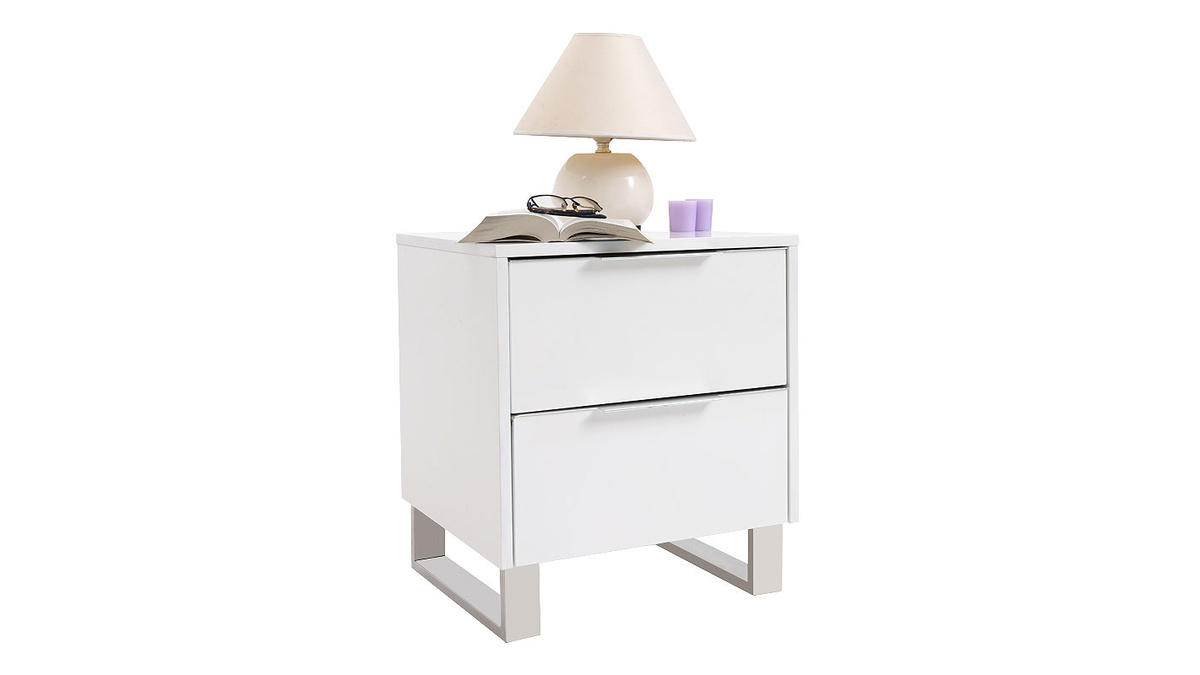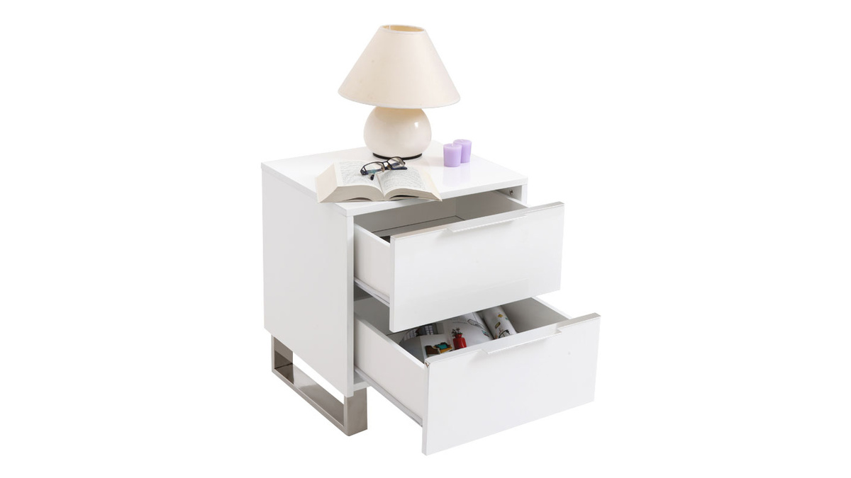 En panneaux de fibres de bois laqué blanc très facile d'entretien, cette table de nuit design sera parfaite dans une chambre à coucher dans l'air du temps. Son piétement en acier chromé et ses poignées très minimalistes signent son allure ultra tendance. Cette table de nuit disposée de chaque côté du lit mettra véritablement en valeur une jolie tête de lit épurée.