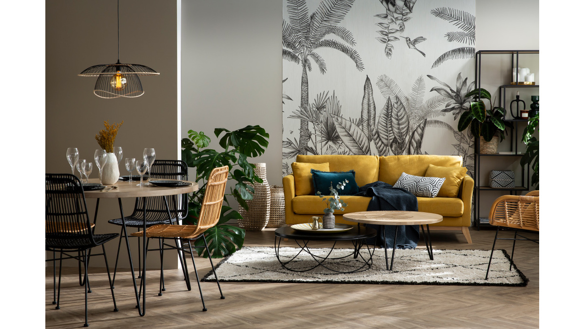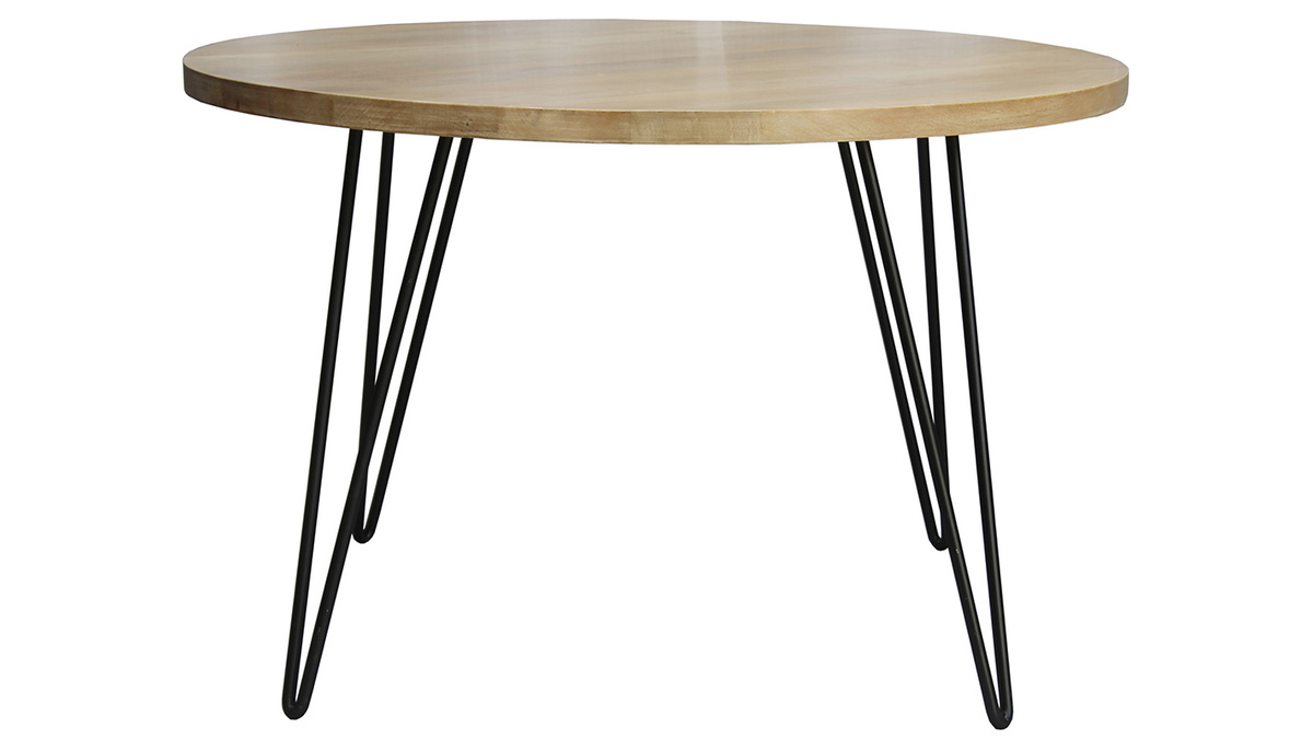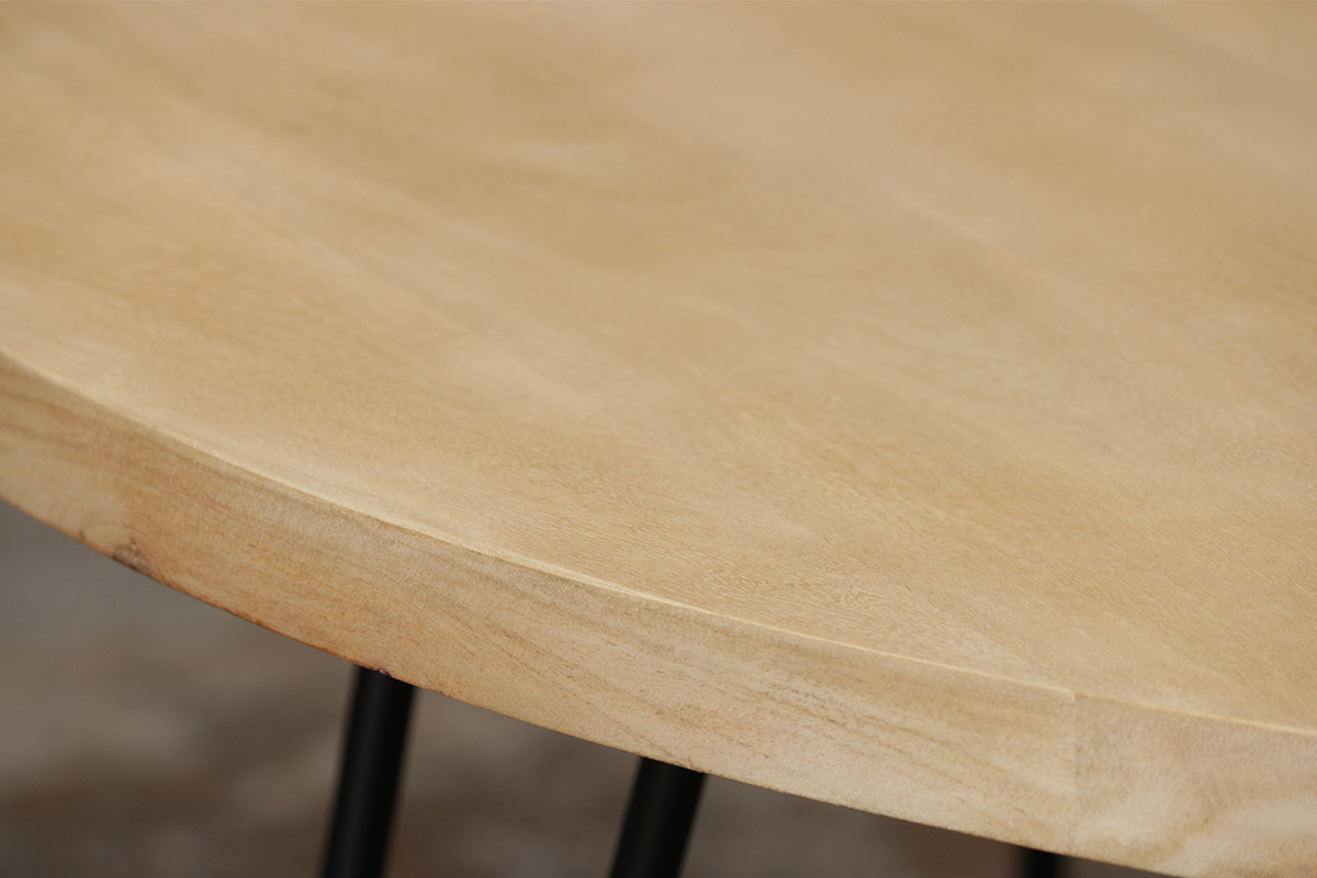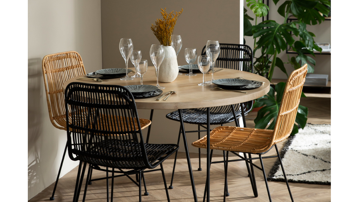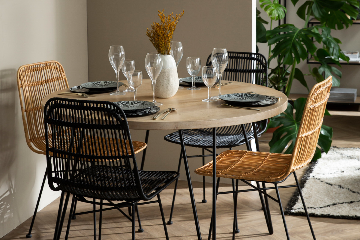 Le plateau est en manguier massif, un bois authentique et chaleureux qui s'intègre en douceur dans nos intérieurs. Il est ici associé à un piétement en métal noir aérien et tout en finesse qui a l'avantage de prendre peu de place. La table à manger ronde VIBES s'accorde particulièrement bien avec les chaises en rotin Malacca.