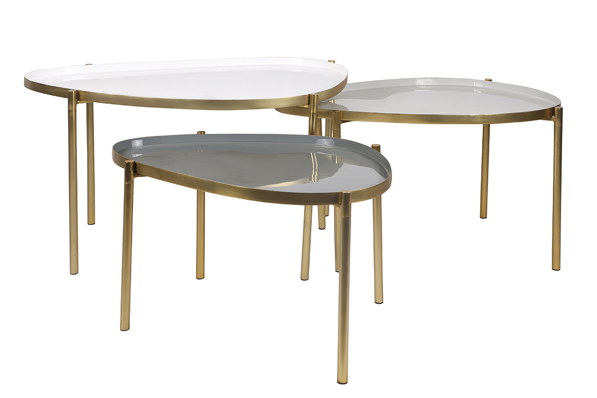 Caroline Marliac, designer Miliboo, a osé une composition audacieuse ! L'association de formes inattendues et de teintes raffinées offre un résultat fabuleux. La structure en acier finition laiton de ces trois tables basses gigognes crée un style sophistiqué. Elle est associée à un plateau travaillé avec des courbes pour un salon tout en douceur. Des aplats laqués de blanc et gris s'ajoutent à cet ensemble. Une composition élégante qui ne laissera personne indifférent !
