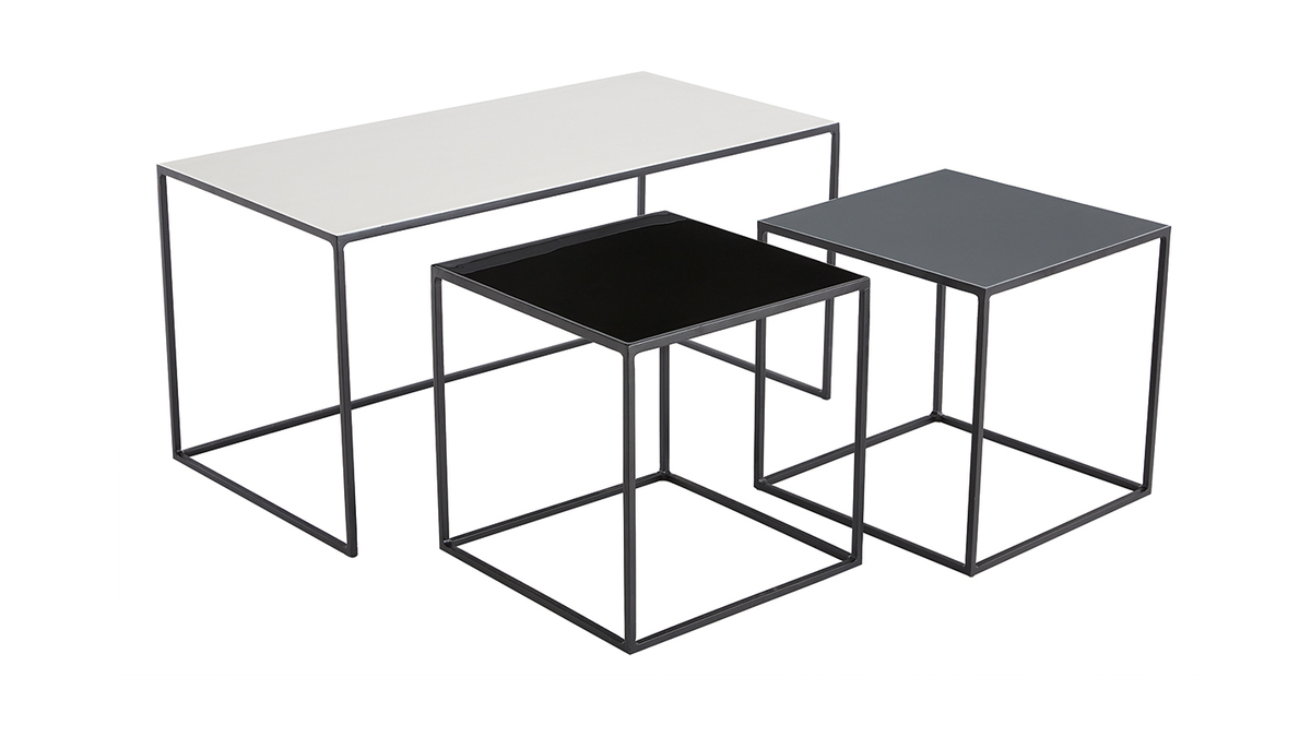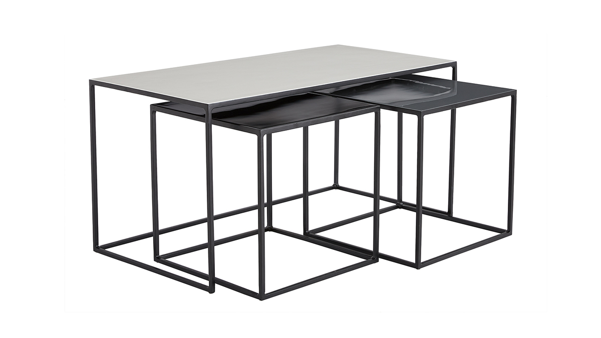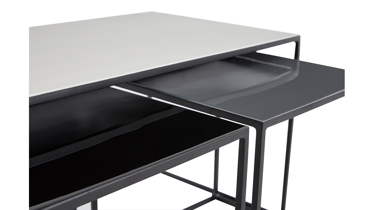 Ces trois tables basses design sont des pièces aériennes et modernes. Ce sont des tables uniques, dont chaque élément est réalisé artisanalement. La finesse de leur structure en métal en fait des tables d'une grande légèreté visuelle qui s'accordent à merveille avec des meubles contemporains. Elles sont composées d'une base en métal et d'un plateau émaillé. Le joli dégradé de teintes neutres fait toute l'élégance de ces tables gigognes contemporaines qu'on imagine très bien dans un séjour minimaliste.