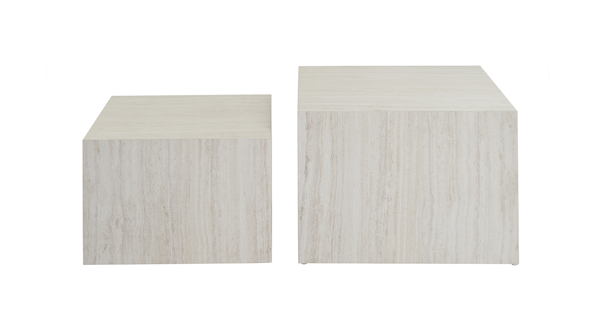 L'aspect travertin magnifie les lignes nettes de ces belles tables basses au look minimaliste. Grâce à un revêtement en papier décor, elles reprennent l'effet de cette roche à la couleur minérale à la perfection. Les nuances douces et l'effet de texture épousent avec élégance les volumes de ces tables gigognes design, de quoi séduire les amateurs de déco contemporaine !