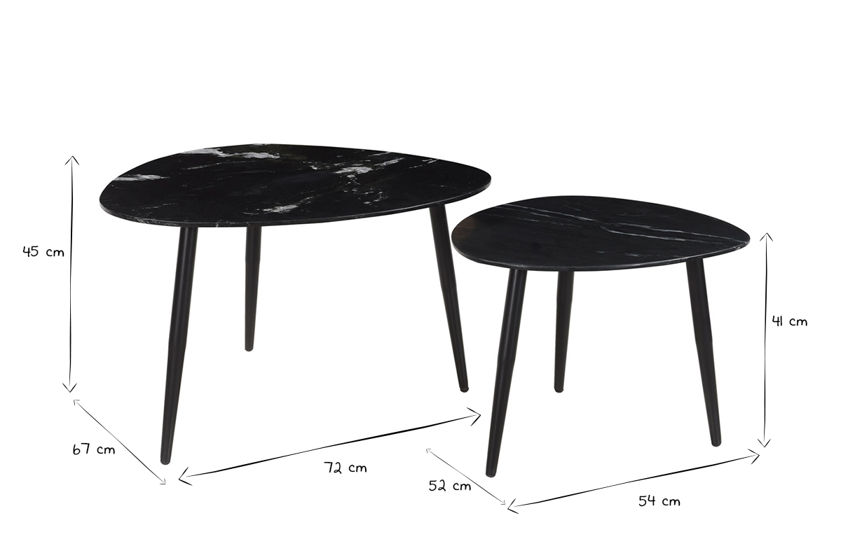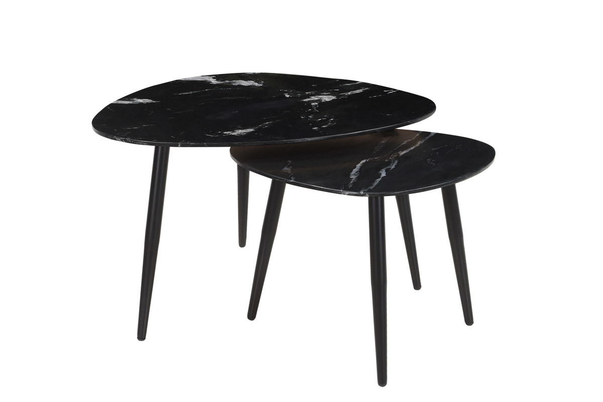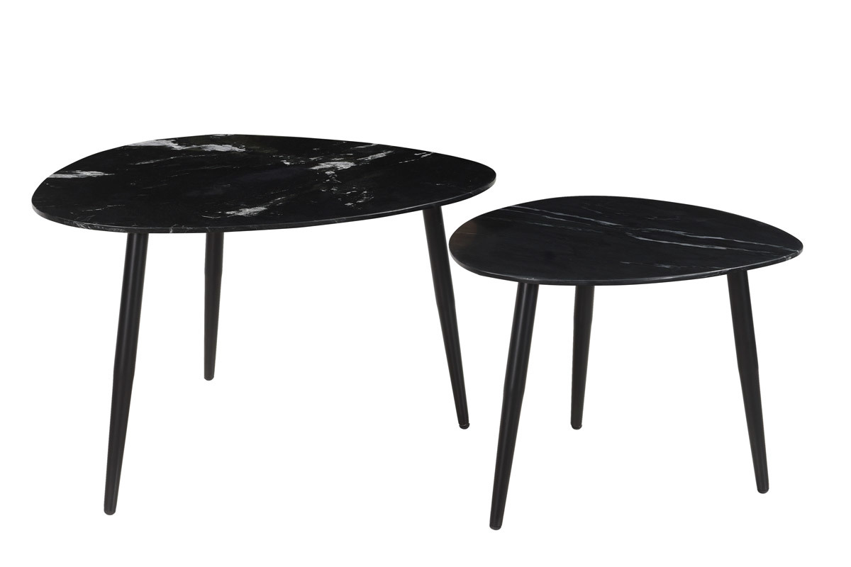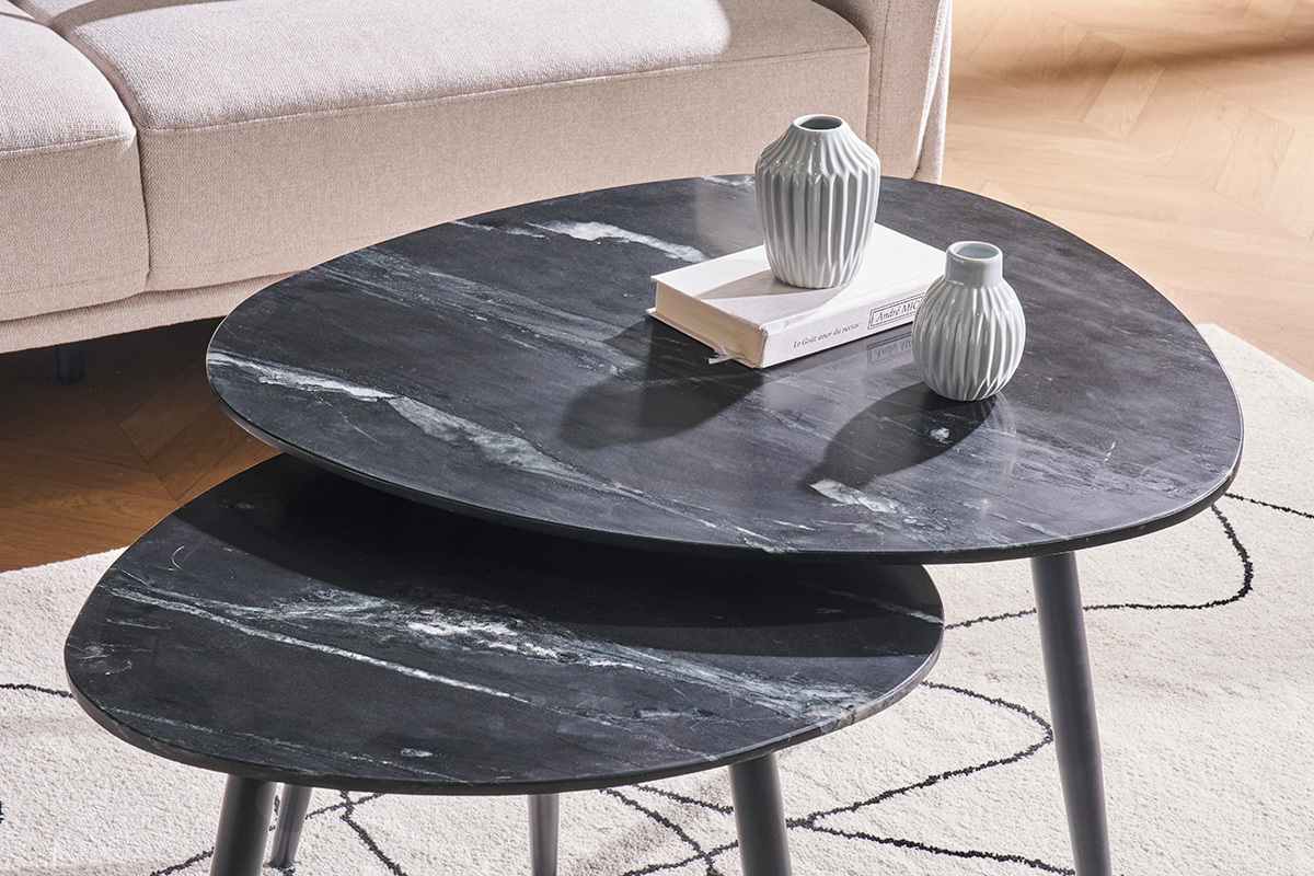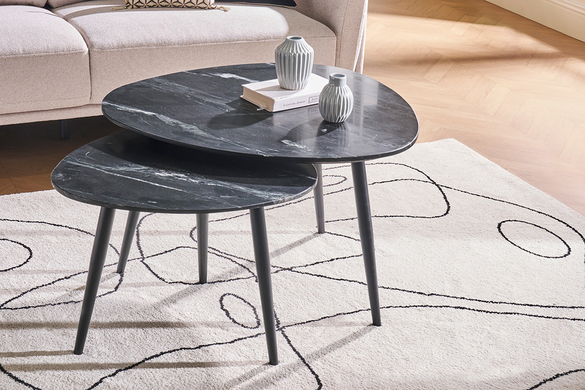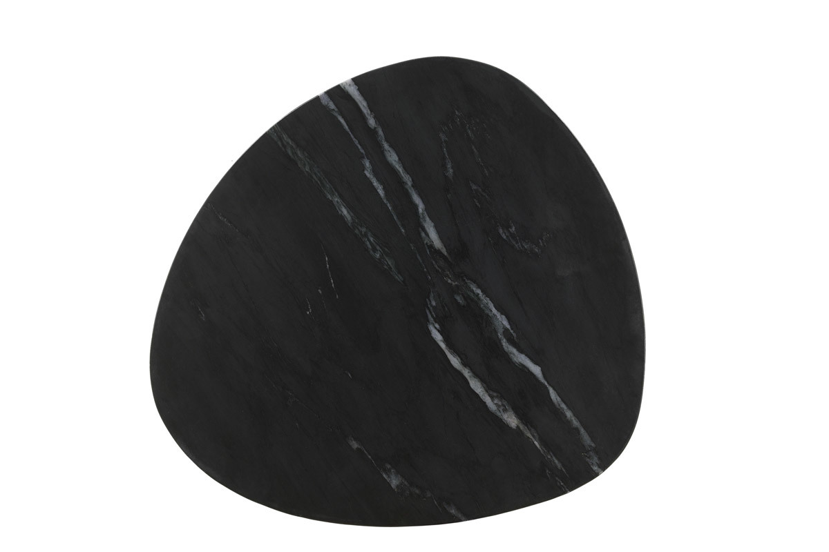 Avec leur esprit trépied, les piètements en métal noir apportent stabilité et modernité aux plateaux en marbre noir nervuré. Tendance et devenu intemporel, ce matériau d'exception doté de nuances et de couleurs infini dévoile ici le sublime contraste du blanc sur la couleur dominante noire. Une association qui ne manquera pas de donner du caractère au salon. Plébiscité par les intérieurs chaleureux, le marbre est une matière noble qui saura apporter tout son cachet aux intérieurs contemporains comme vintage.