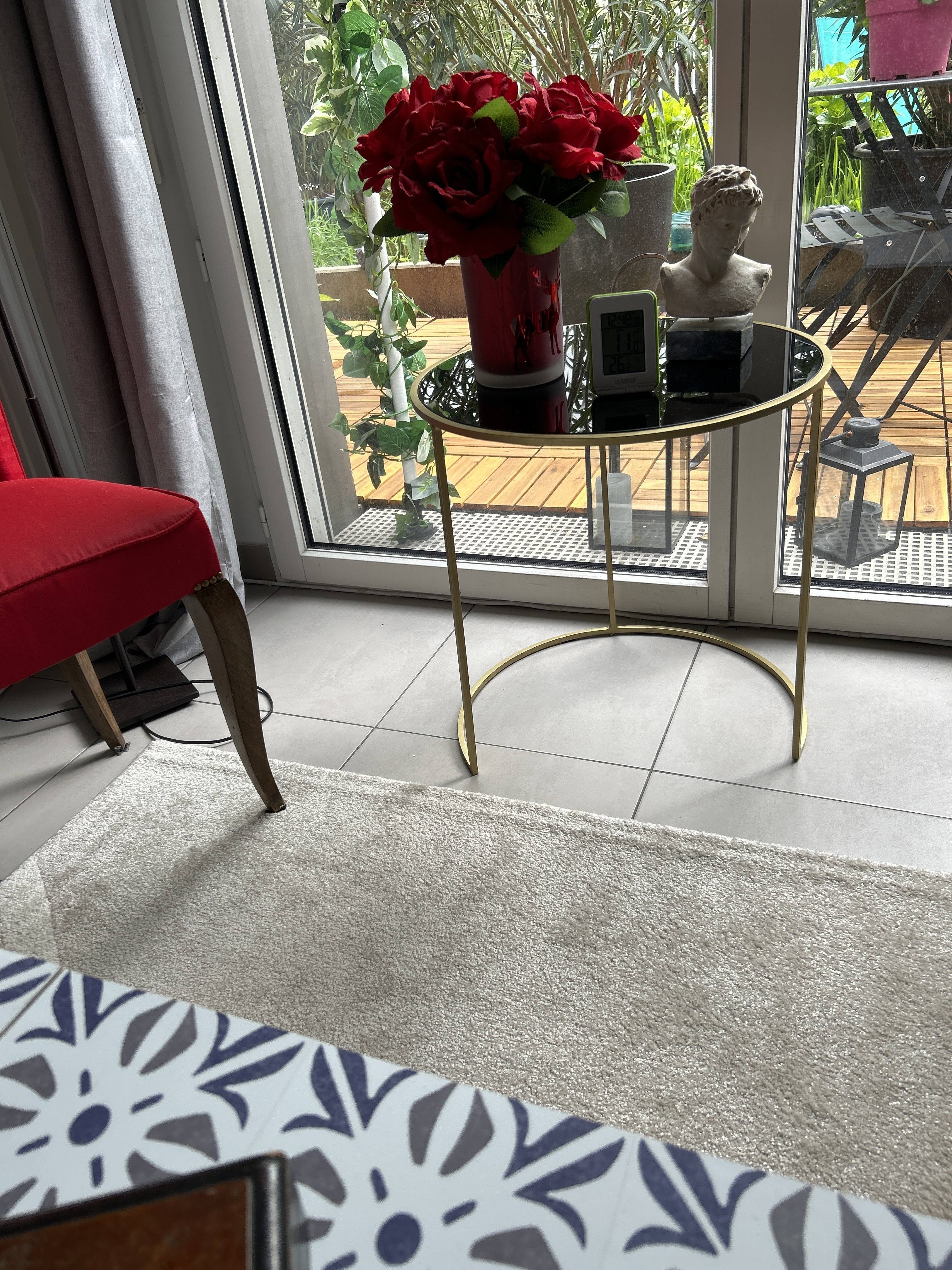 Matière : Plateau en verre teinté noir, structure en métal doré