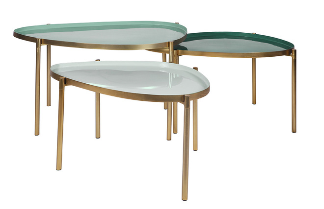 Caroline Marliac, designer Miliboo, a osé une composition audacieuse ! L'association de formes inattendues et de teintes raffinées offre un résultat fabuleux. La structure en acier finition laiton de ces trois tables basses gigognes crée un style sophistiqué. Elle est associée à un plateau travaillé avec des courbes pour un salon tout en douceur. Des aplats laqués dans des nuances de cyan et de vert s'ajoutent à cet ensemble. Une composition élégante qui ne laissera personne indifférent !
