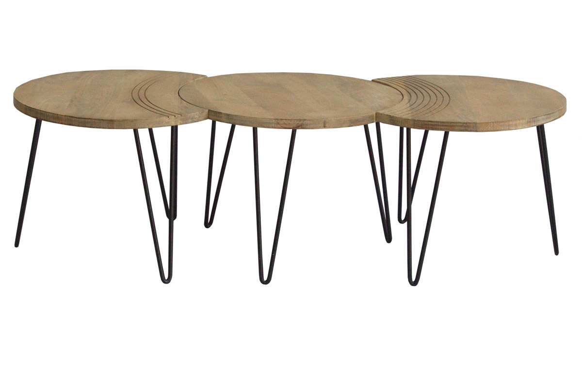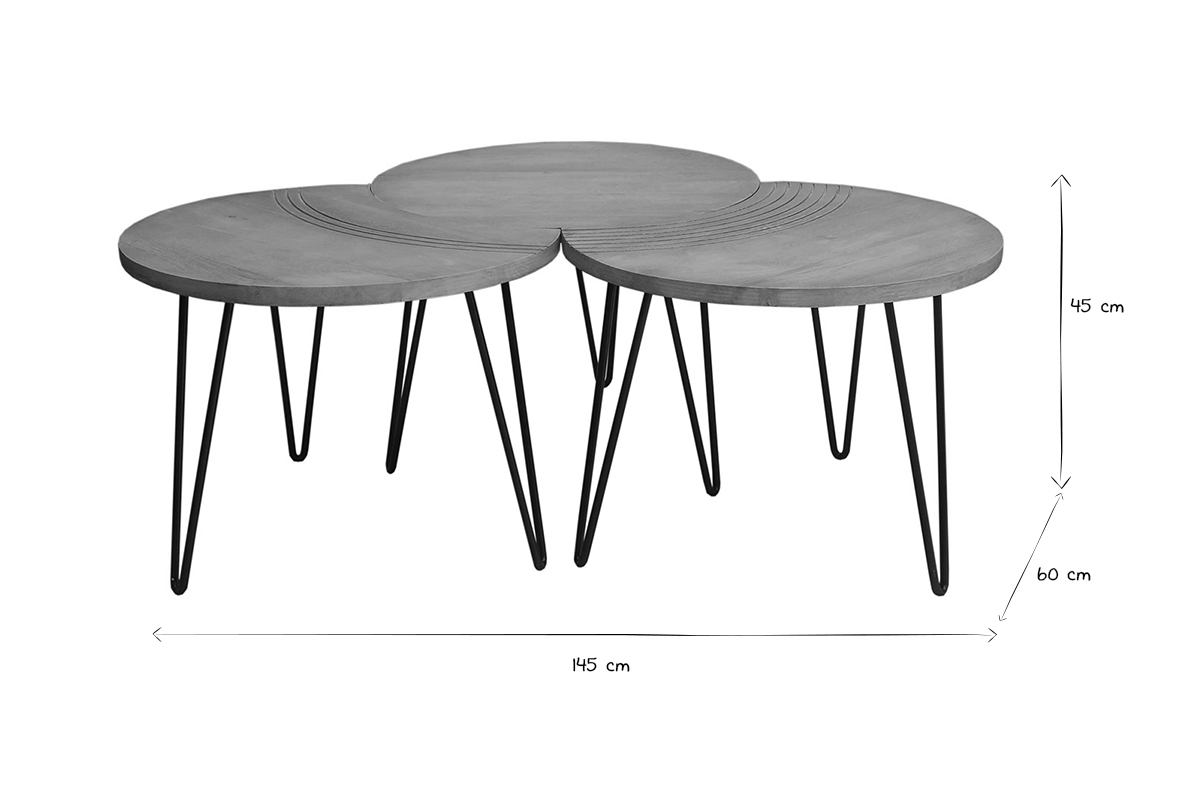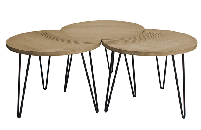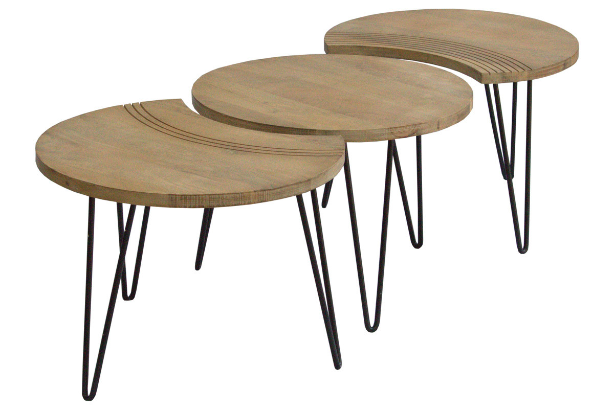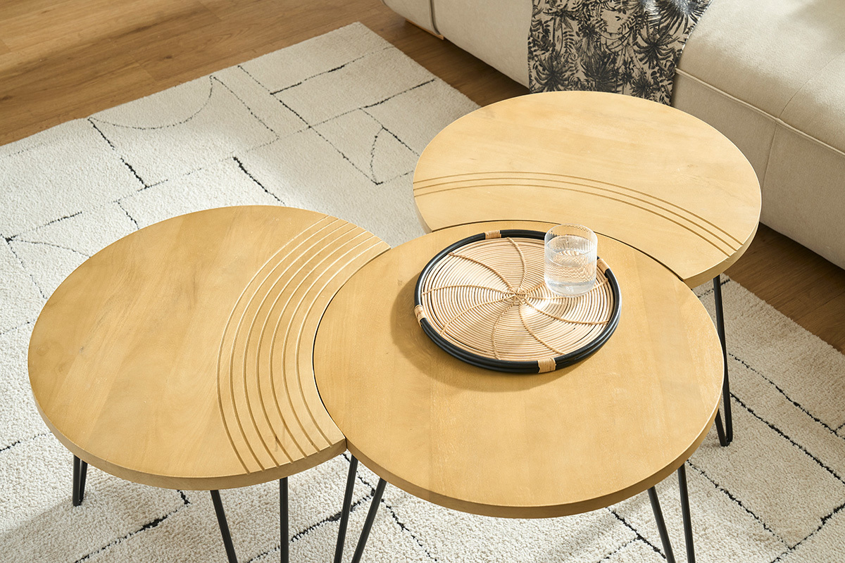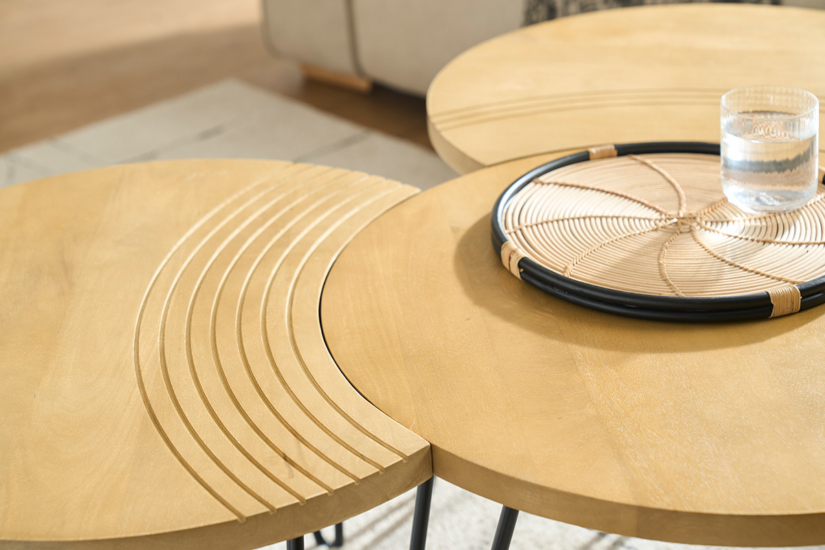 Deux des tables ont un côté incurvé, rappelant un croissant de lune, et sont gravées avec de jolis arcs de cercles pour souligner leur forme. La troisième table est totalement ronde et dispose d'un diamètre de 60 cm. Composez votre espace salon au gré de vos envies en associant les 3 tables, ou seulement deux pour en placer une en table d'appoint dans un coin de la pièce. Tout est possible et le rendu sera au rendez-vous.