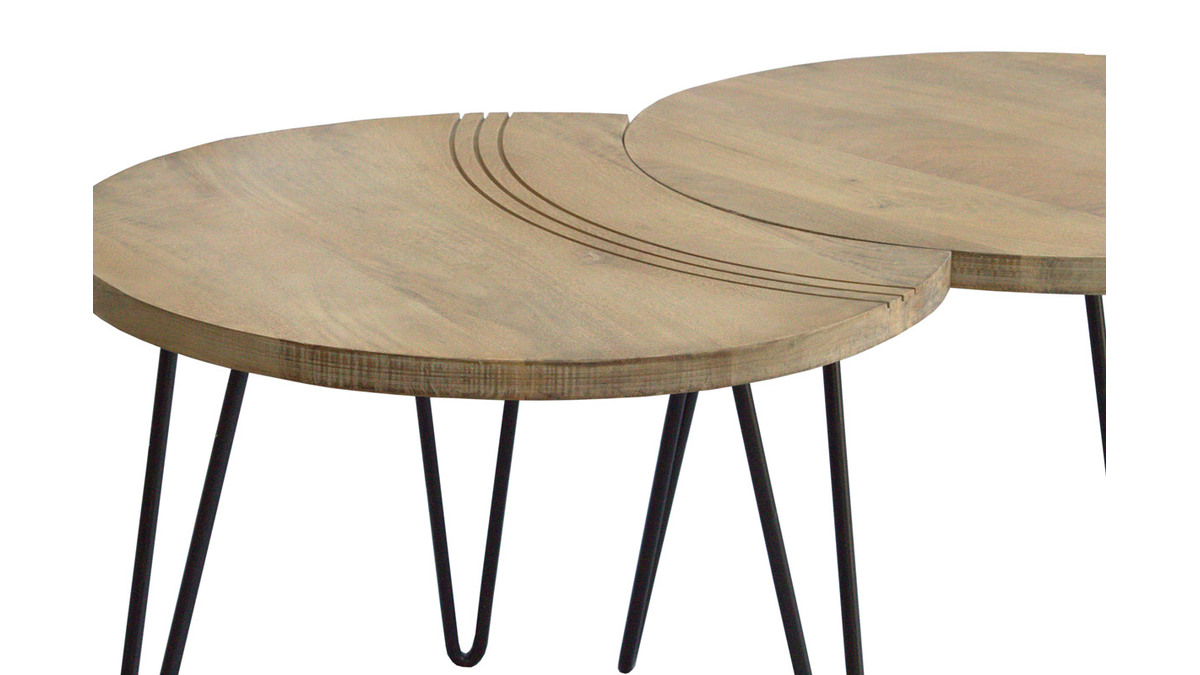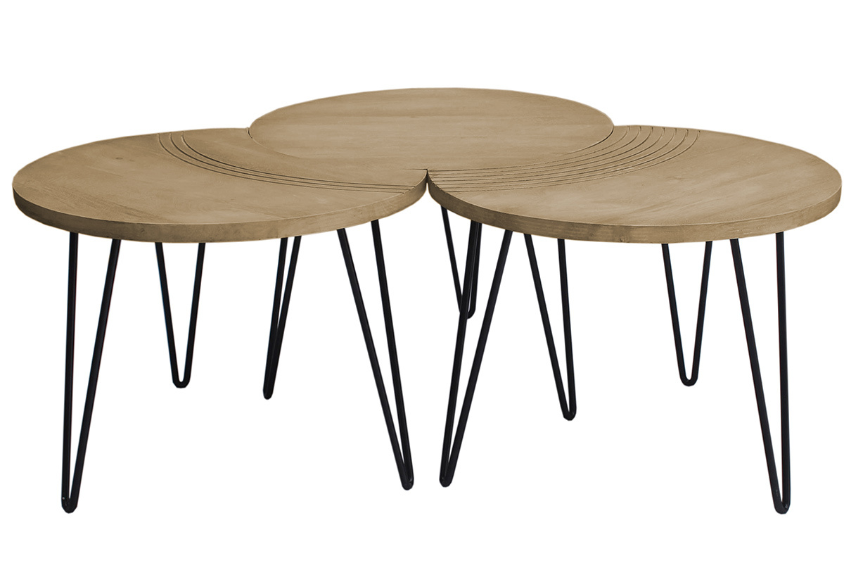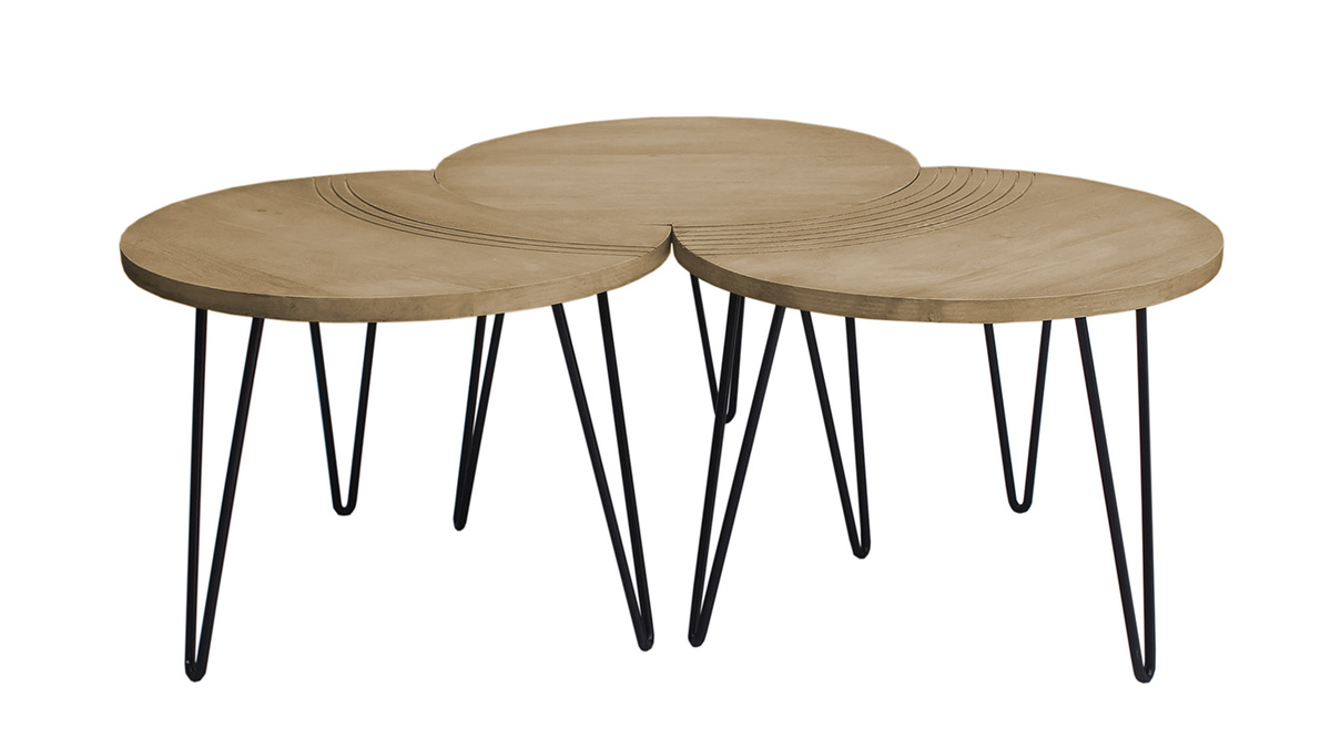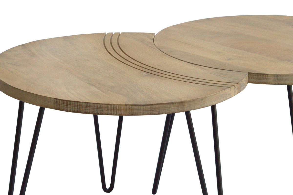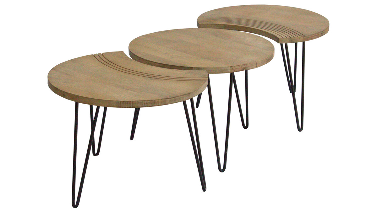 Deux des tables ont un côté incurvé, rappelant un croissant de lune, et sont gravées avec de jolis arcs de cercles pour souligner leur forme. La troisième table est totalement ronde et dispose d'un diamètre de 60 cm. Composez votre espace salon au gré de vos envies en associant les 3 tables, ou seulement deux pour en placer une en table d'appoint dans un coin de la pièce. Tout est possible et le rendu sera au rendez-vous.