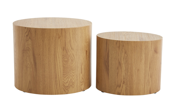 Une ligne tout en courbes, un joli décor chêne, une base pleine... ces deux tables basses sont de belles pièces design et chaleureuses. Leur charme réside dans l'association d'une forme ovale et d'un support sans pied contemporain. Ce mariage offre un rendu moderne tout en délicatesse.