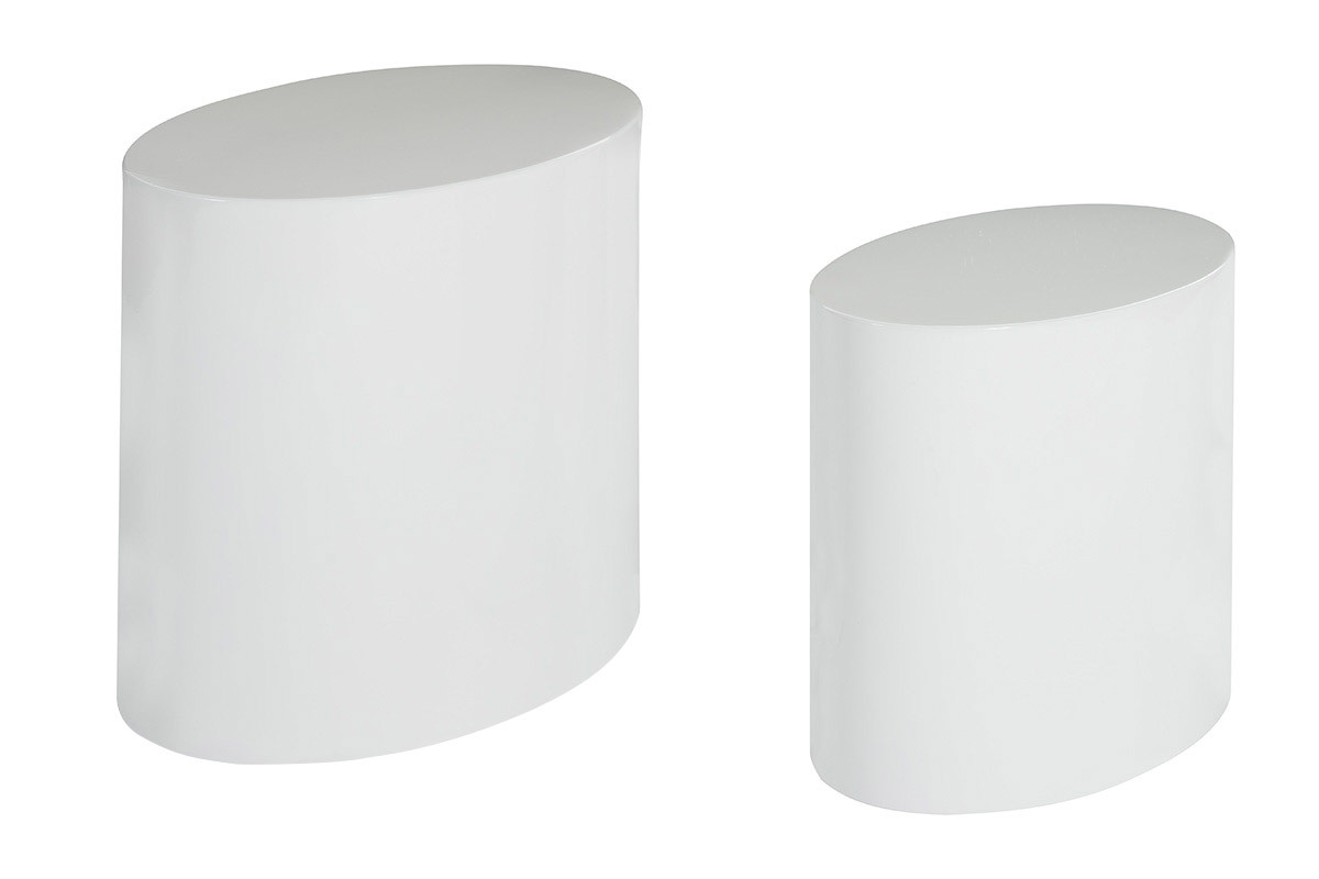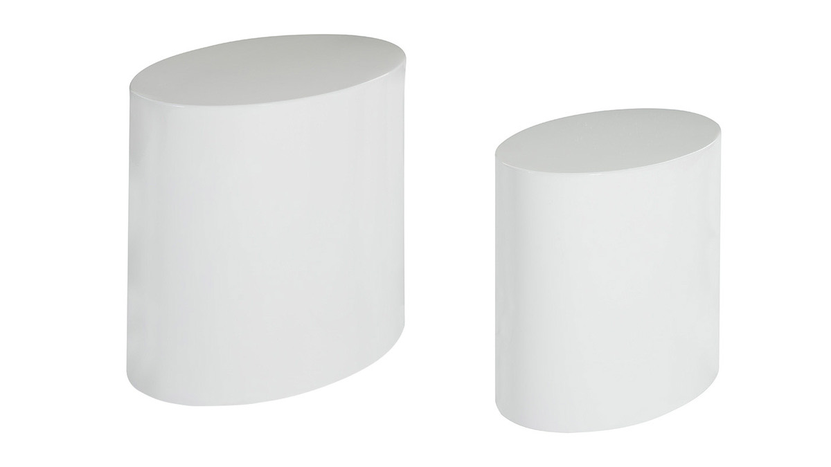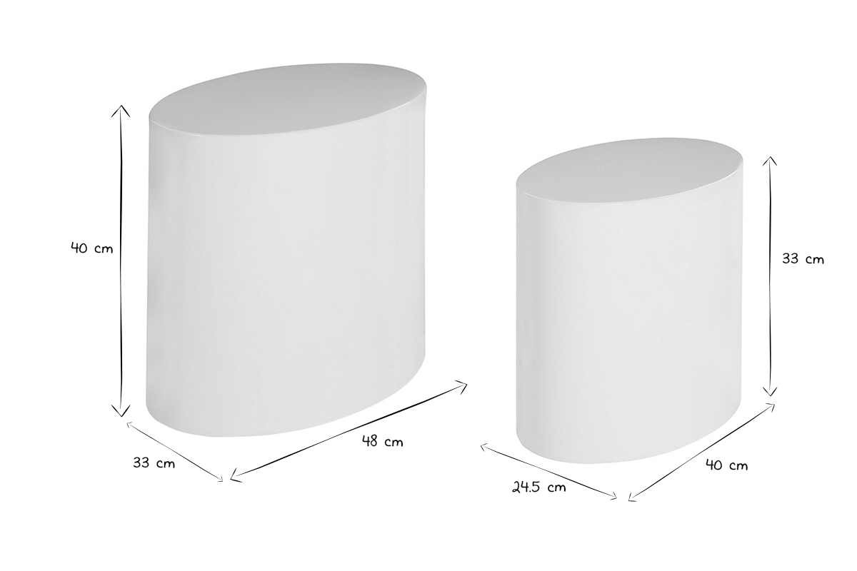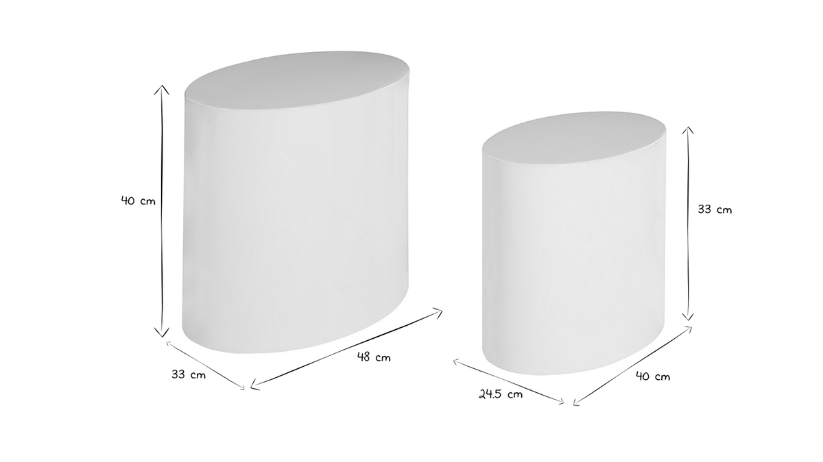 Besoin de ranger occasionnellement vos tables ? Dans l'esprit gigogne, ce lot de 2 tables basses ovales en panneaux de fibres de bois finition blanc laqué se combinent en un clin d'oeil. Dissimulée par la grande table (L33 x P48 x H40 cm), la petite table (L24.5 x P40 x H33 cm) s'efface au profit d'un seul bloc graphique. Discrétion et faible encombrement garantis !