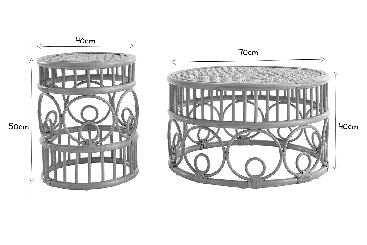 Ce lot de 2 tables basses en rotin se compose d'une grande table basse ronde D70 x H40 cm et d'une petite table basse ronde D40 x H50 cm. Toutes deux conçues à partir d'un plateau en bambou tressé, croisillons et arabesques se mêlent pour former d'élégants piètements ajourés tout en rondeur. Un jeu de spirales picturales, prêt à rythmer l'espace du séjour !