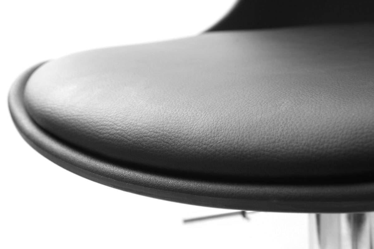 Le tabouret de bar design STEEVY est en polyuréthane et polypropylène, le socle et le repose-pied sont en métal chromé. Rotation 360°.