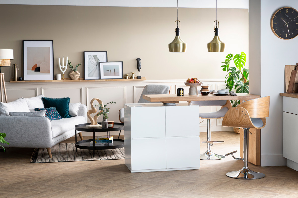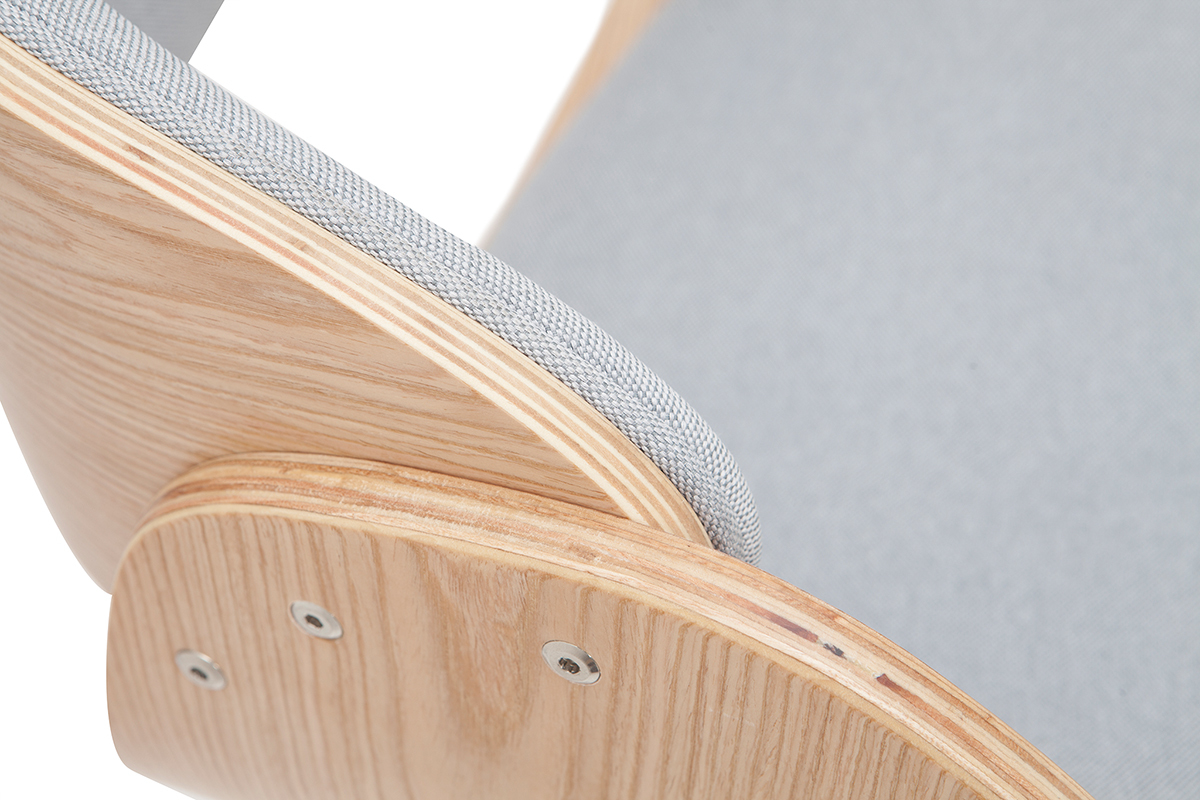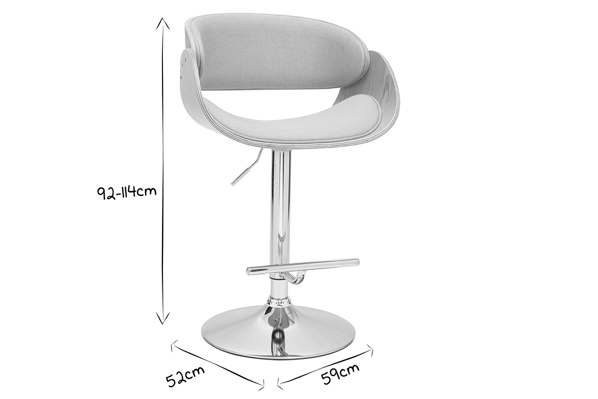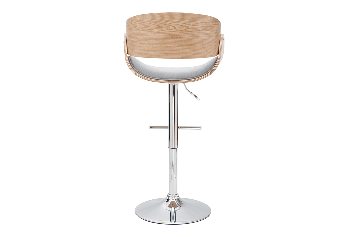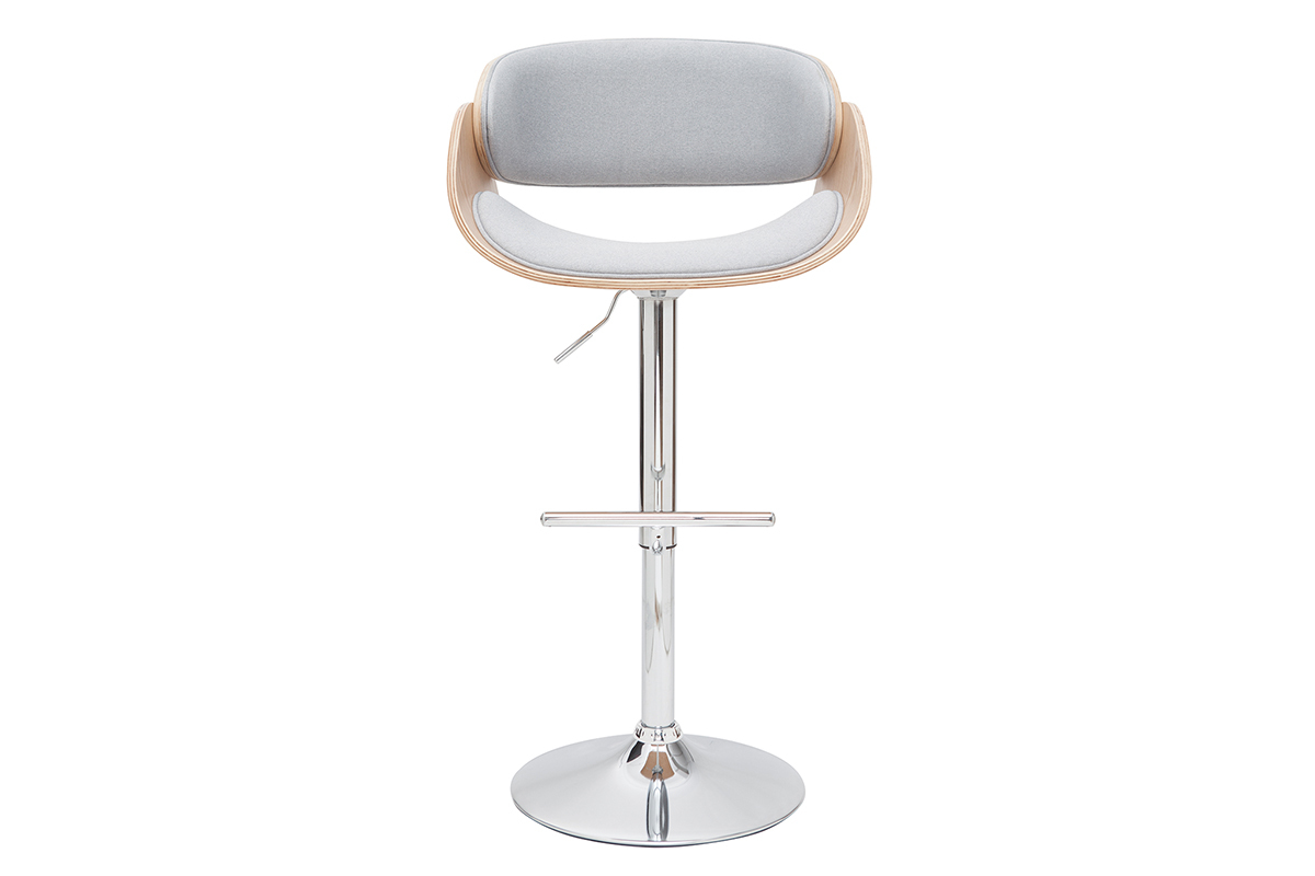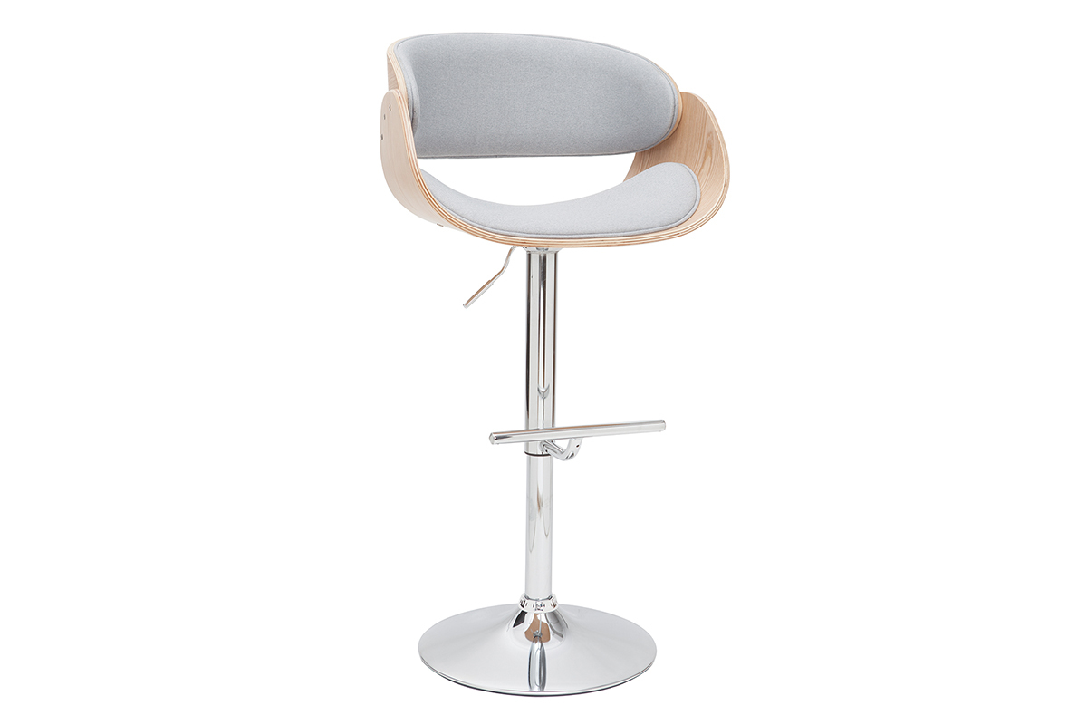 Son design a été travaillé pour faire de ce tabouret réglable une assise sobre et originale, facile à intégrer dans son intérieur. Le mélange entre un siège en polyester gris, une structure en bois clair cintré et un piétement chromé rend unique ce tabouret haut. Grâce à ses lignes courbes et la finesse de son design, cette assise apportera une touche de modernité dans une cuisine, autour d'un îlot central, ou dans une pièce à vivre associée à une table haute ou un comptoir.