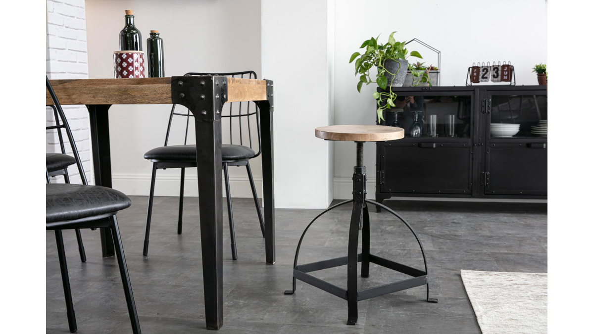 Grâce à son repose-pieds intégré et sa hauteur de 65 cm, il pourra être utilisé comme siège d'appoint autour d'un îlot ou d'un comptoir de 90 cm de haut. Pour compléter une décoration dans l'esprit factory, découvrez toute la gamme de meubles INDUSTRIA.