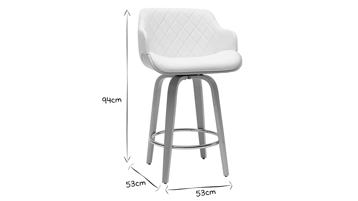 Avec une hauteur d'assise H65 cm, ce tabouret de bar fixe H65 cm blanc et bois clair convient parfaitement au plan de travail H90 cm. Équipé d'un repose-pieds et d'un fauteuil rotatif, ce modèle de tabouret de bar blanc pivotant 360° offre confort et bonne posture à ses utilisateurs.