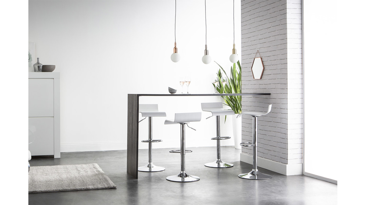Fini le casse-tête pour réunir toute la maisonnée autour du plan de travail ! En un clin d'oeil, à l'aide de la manette située sous le siège, ce tabouret de bar réglable blanc et acier chromé s'ajuste en hauteur d'assise (H58 à H80 cm). Petits et grands pourront s'asseoir confortablement autour de votre îlot de cuisine ou de votre table de bar !