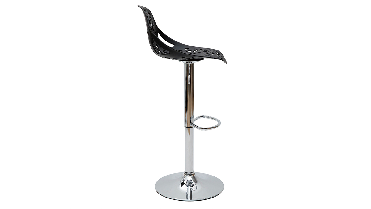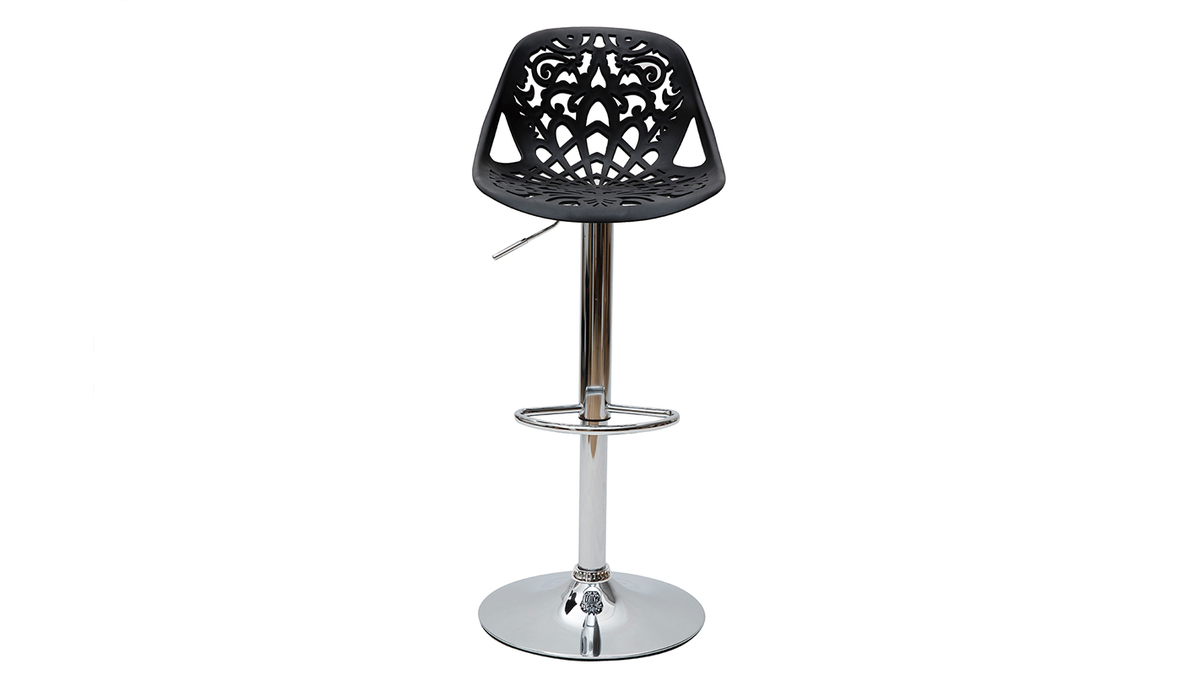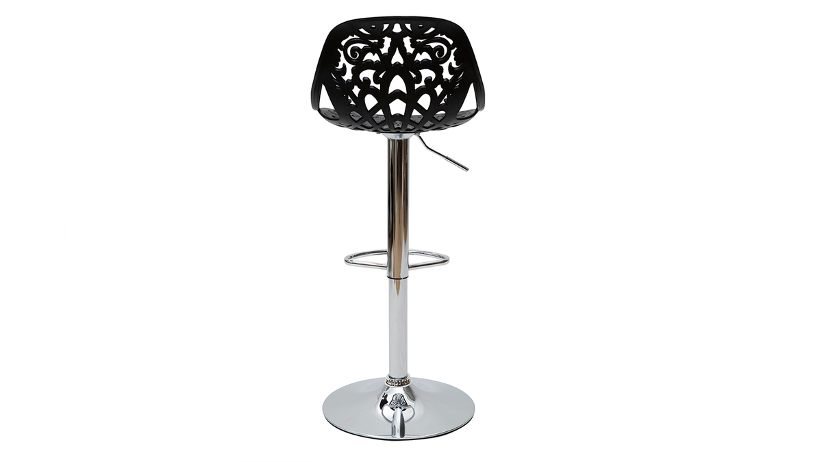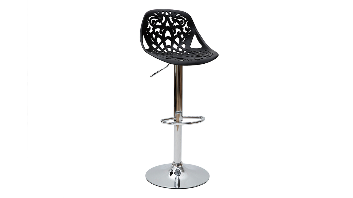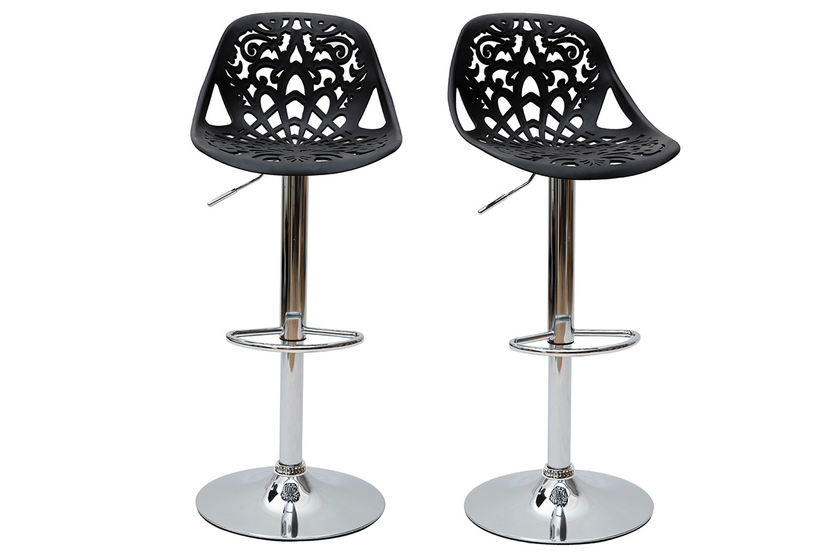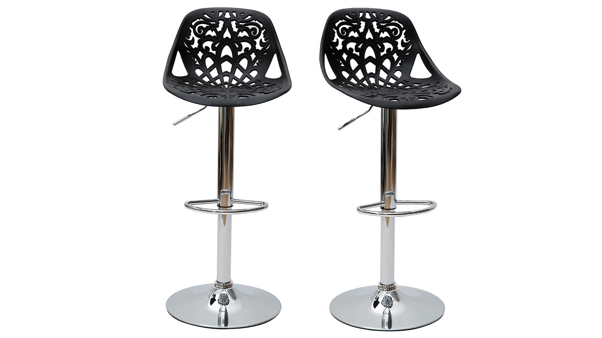 Leur assise dentelée et leur forme tout en rondeur confèrent une ambiance baroque à tous types d'intérieur. Faites le choix d'une déco originale et résistante avec ces tabourets hauts en polypropylène noir montés sur un pied en acier chromé.